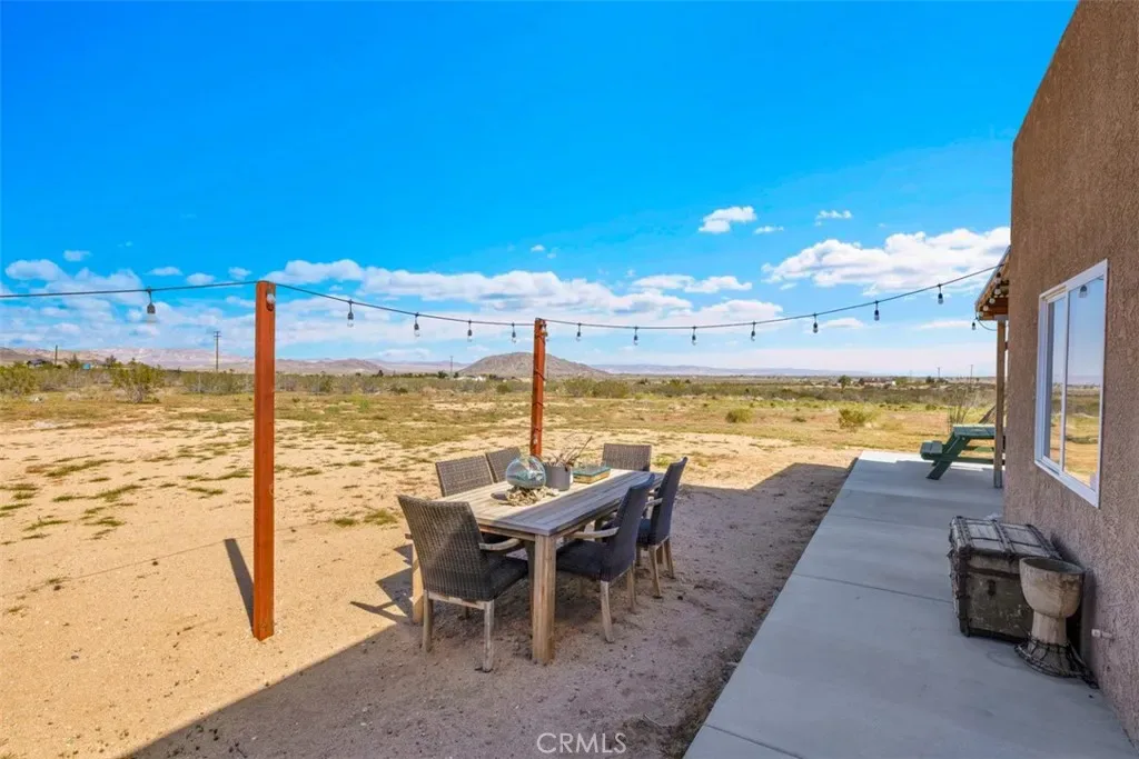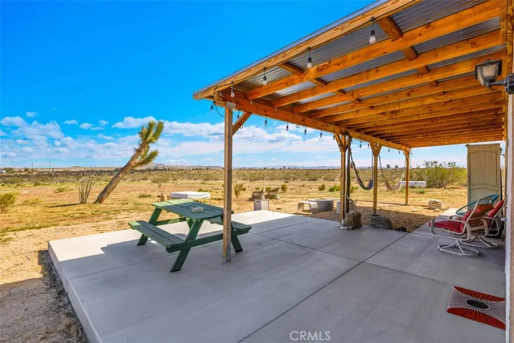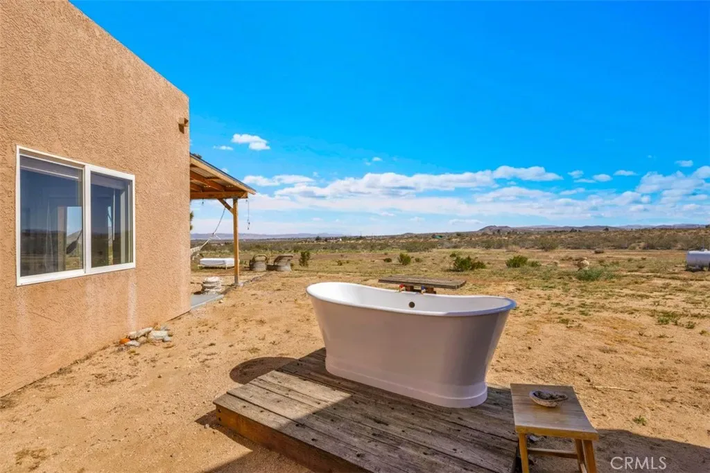 The home also includes an outdoor soaking tub, ideal for unwinding after a day exploring the desert. The property features central air conditioning for comfort and a detached garage for additional storage or workspace. With plenty of open land surrounding the home, there is ample opportunity to create your own private desert oasis.