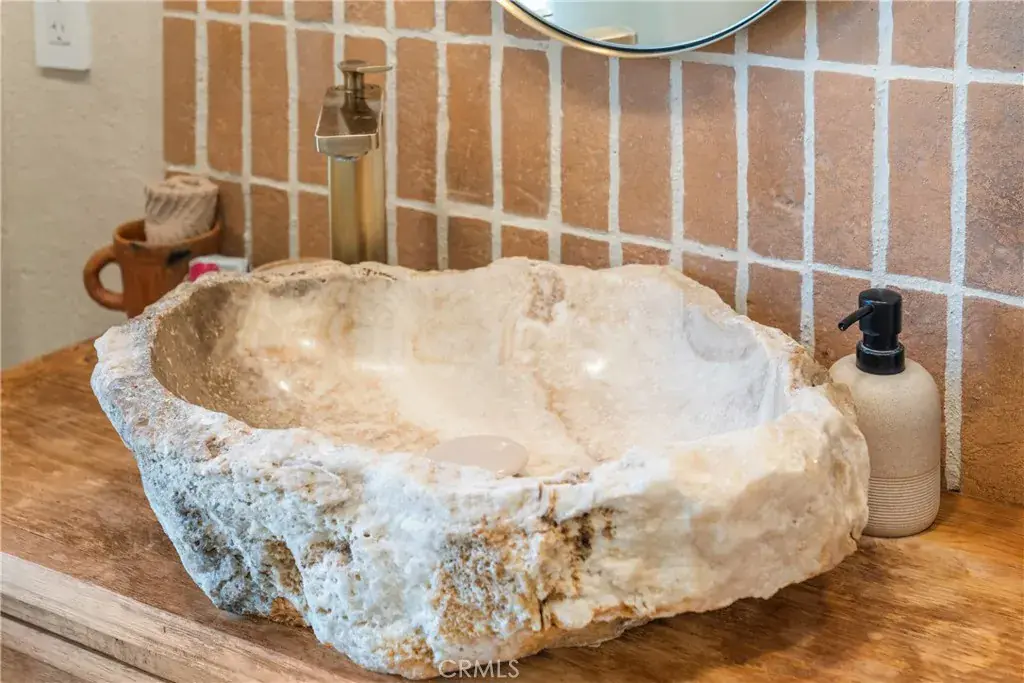 The living space is anchored by a custom-built fireplace, perfect for intimate gatherings in the private courtyard, where the stars above create a magical ambiance. The kitchen and bathroom boast natural stone elements that evoke the raw elegance of the desert landscape.
