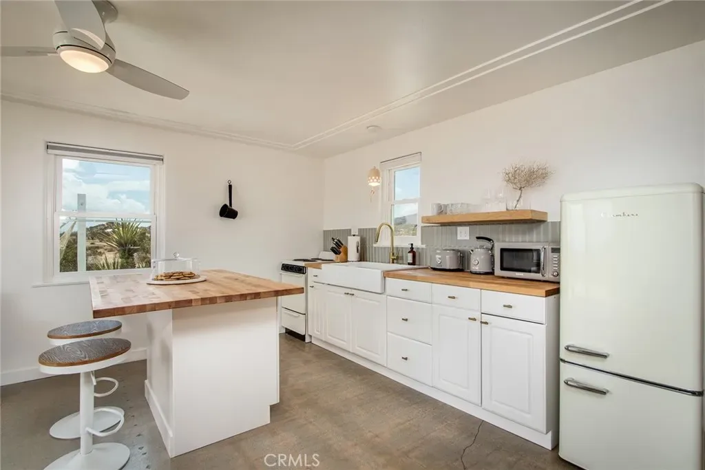 PRICE REDUCTION: Authentic Mid-Century Modern 2-Bedroom/2-Bathroom Bungalow – updated and reimagined by owner/architect, featuring new kitchen cabinets and island with butcher block counters and farmhouse sink. Polished concrete floors throughout. Floor-to-ceiling tile in walk-in shower. Zoned ductless mini-split heating/cooling for efficiency. Heated & Filtered Cowboy pool for year-round use. Shaded front porch to relax for morning or evening beverages. Rural location spread over a large 5-Acre parcel for privacy. Commanding views of iconic Goat Mountain. Short distant to world-famous Giant Rock for wilderness excursions. Local gourmet eateries, including La Copine & Giant Rock Reading room, great for socializing as well. Only a short drive to Joshua Tree National Park and Pappy & Harriet’s in Pioneertown for music. Great getaway but also perfect for remote work. Whether a vacation getaway or a primary residence, the rural ambiance is the grounding factor along with its convenient location to shopping & dining in nearby Flamingo Heights, Yucca Valley or Joshua Tree.
