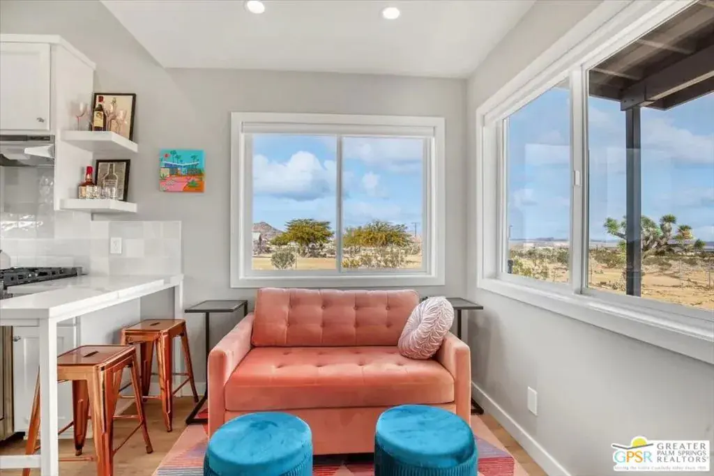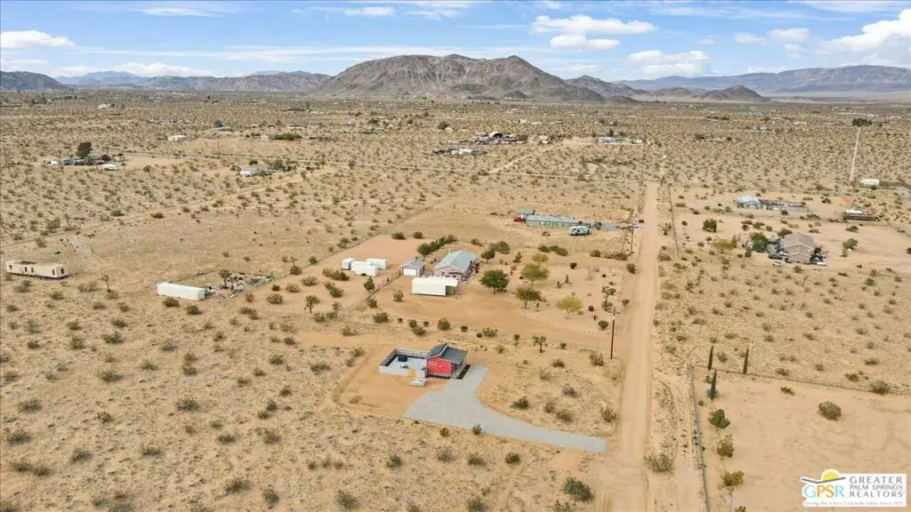 A stylish, custom luxury container home located near Joshua Tree National Park an ideal desert getaway. This cozy yet modern retreat features a private hot tub, fully stocked kitchen, and a fenced backyard designed for ultimate relaxation, complete with a fire pit and BBQ. Set on 2.5 acres of secluded desert land, the property offers exceptional privacy, breathtaking sunrise views, and world-class stargazing in a true dark-sky area. Designed to capture sweeping views of the open desert and iconic Goat Mountain, the home is both photo-worthy and thoughtfully crafted for comfort and serenity. Located just off a paved road, the property offers ample open land with potential to add additional structures, homes, or amenities. Currently operating as a successful vacation rental please call ahead to schedule your showing.