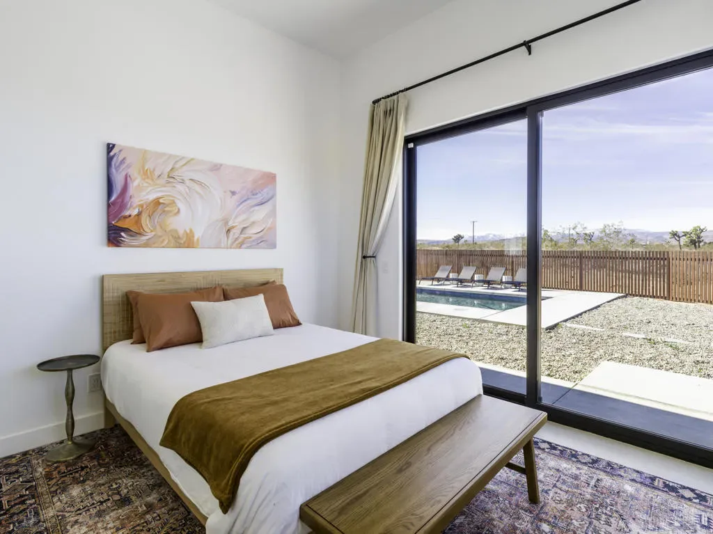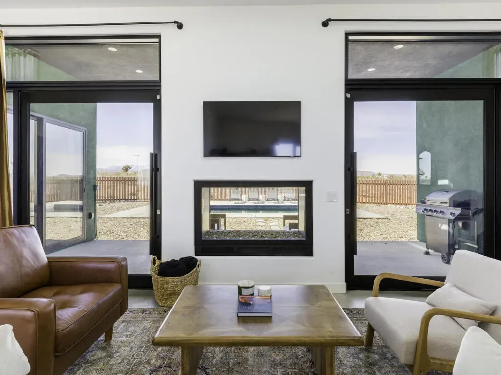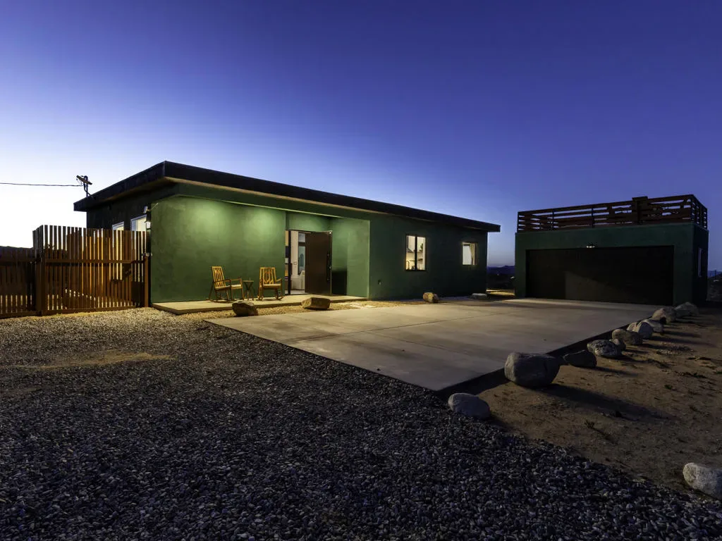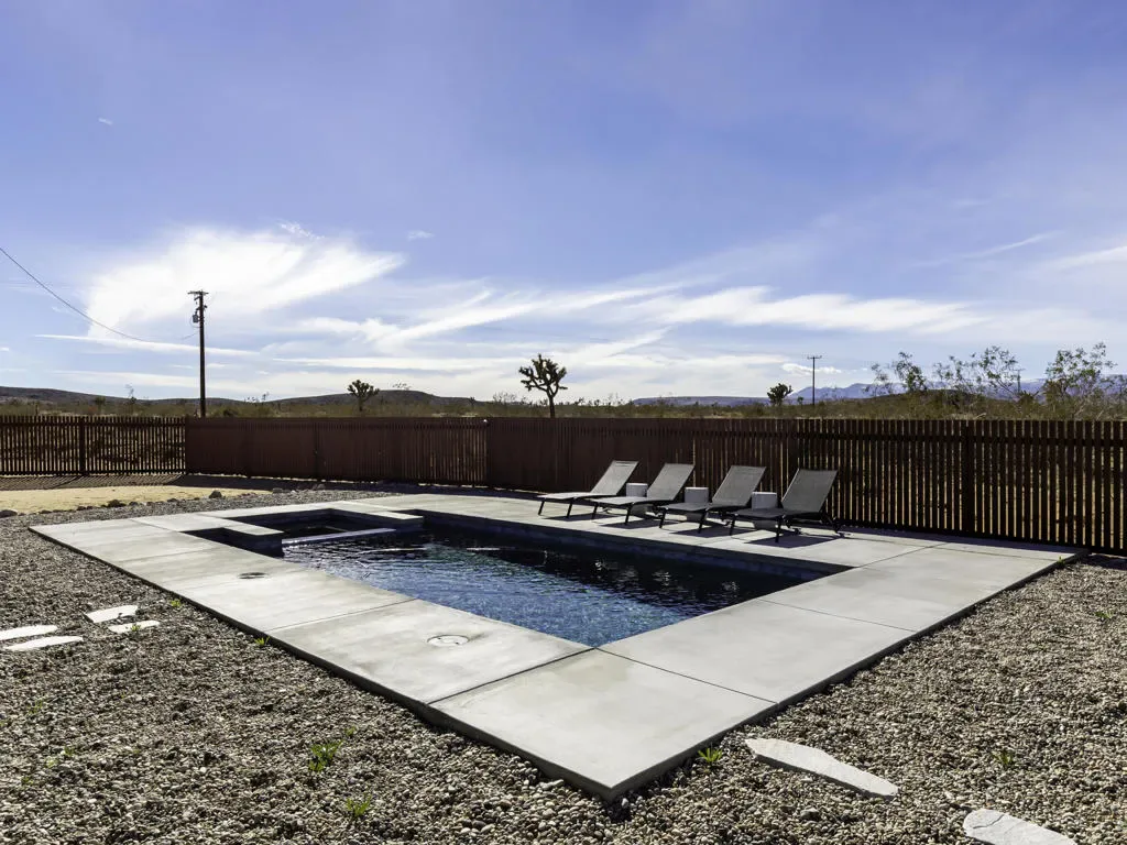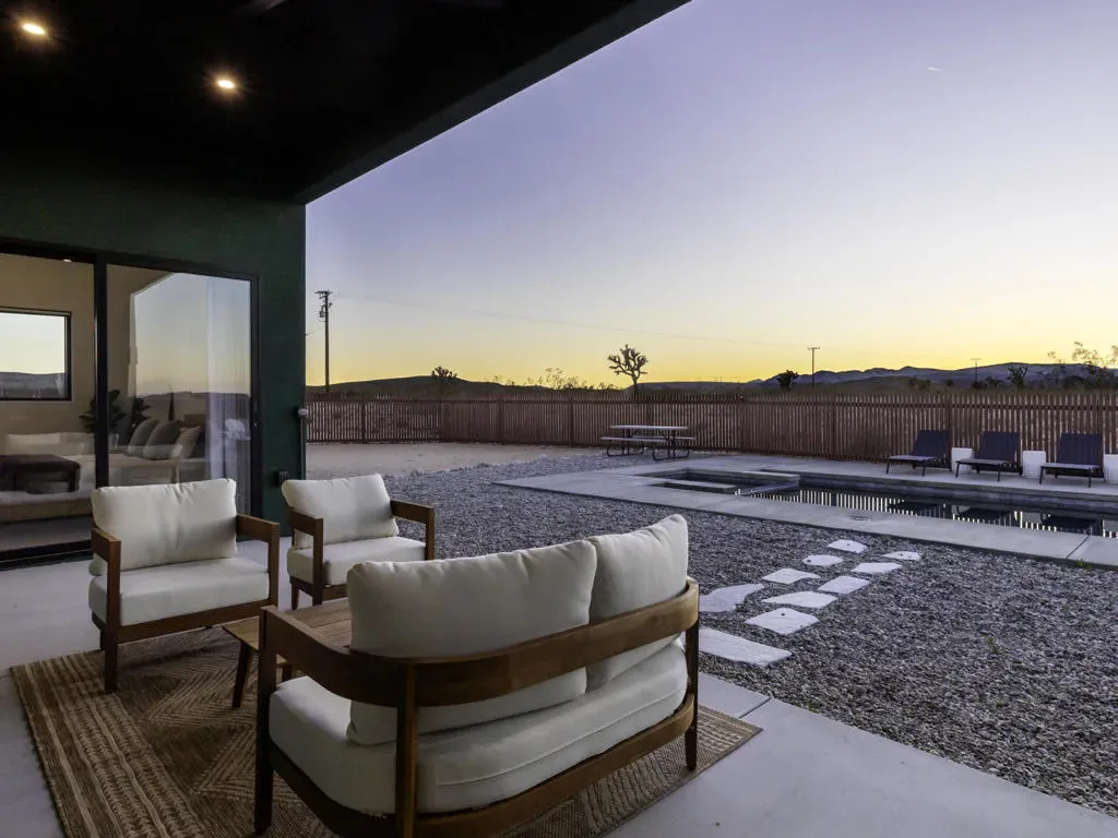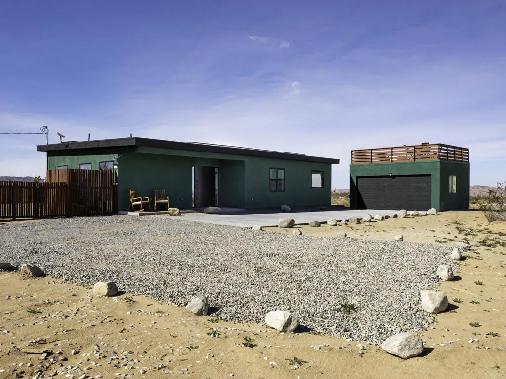 ”The G.O.A.T. at Goat Mountain offers a rare opportunity to own a private High Desert retreat set on approximately 5 acres of pristine land with sweeping views and complete seclusion–no neighboring properties, just open sky and natural beauty. This newer, architecturally refined home blends modern luxury with effortless comfort. A covered front porch opens to an elegant open-concept layout featuring a gourmet kitchen with waterfall quartz countertops, open shelving, statement lighting, and seamless flow into the family room. A striking two-sided indoor/outdoor fireplace anchors the space, while expansive custom glass pivot doors frame breathtaking desert views and enhance indoor-outdoor living. The private primary suite is a serene escape with a spa-inspired bath, soaking tub, walk-in shower, and double vanity. Two additional bedrooms are located in a separate wing and share a beautifully designed full bath. Outdoor living is elevated with a rooftop deck ideal for stargazing, a custom pool and spa, and a thoughtfully designed back porch perfect for relaxing or entertaining. Property features include fully owned solar, EV chargers, and a cement pad intended for a future tiny home addition, located on the rear of the property with water already run and easy connection to existing septic and power. Under San Bernardino County zoning, this nearly 5-acre property allows for expansion and qualifies for two short-term rental permits. The home is currently an active, successful short-term rental, offering both lifestyle and income potential. A rare blend of privacy, luxury, and opportunity–this is more than a home, it’s a destination.”
