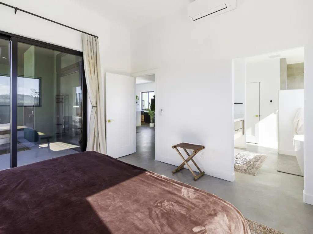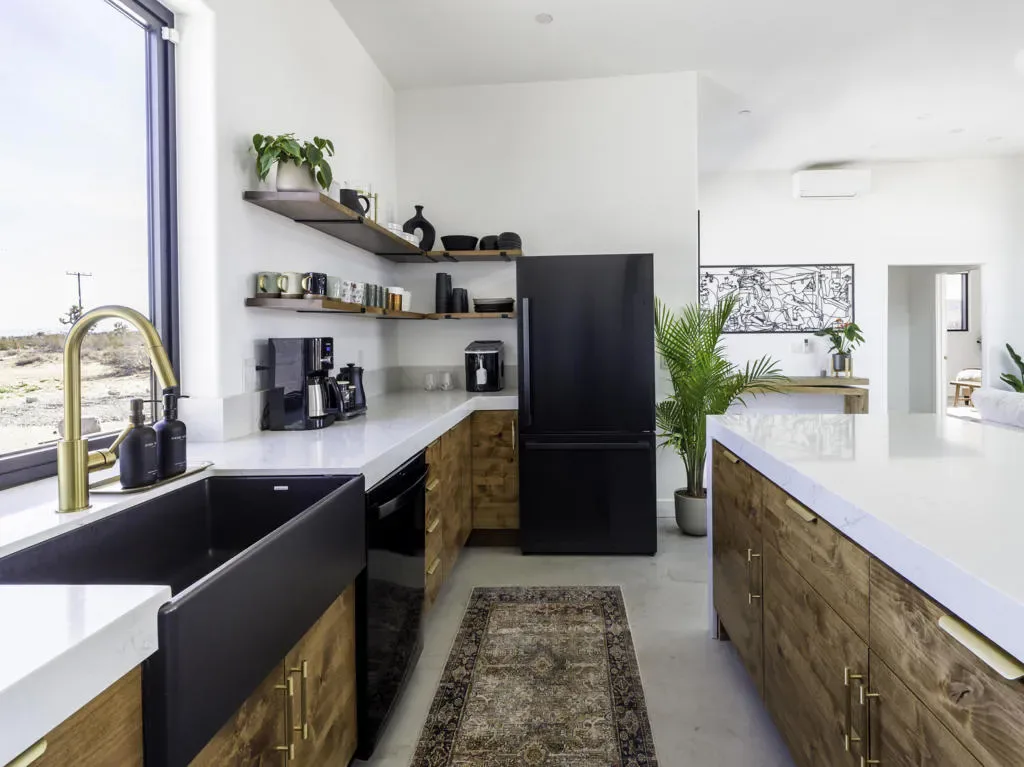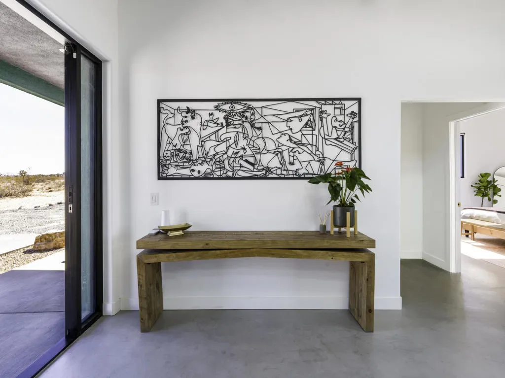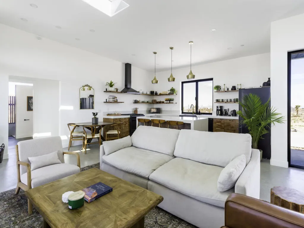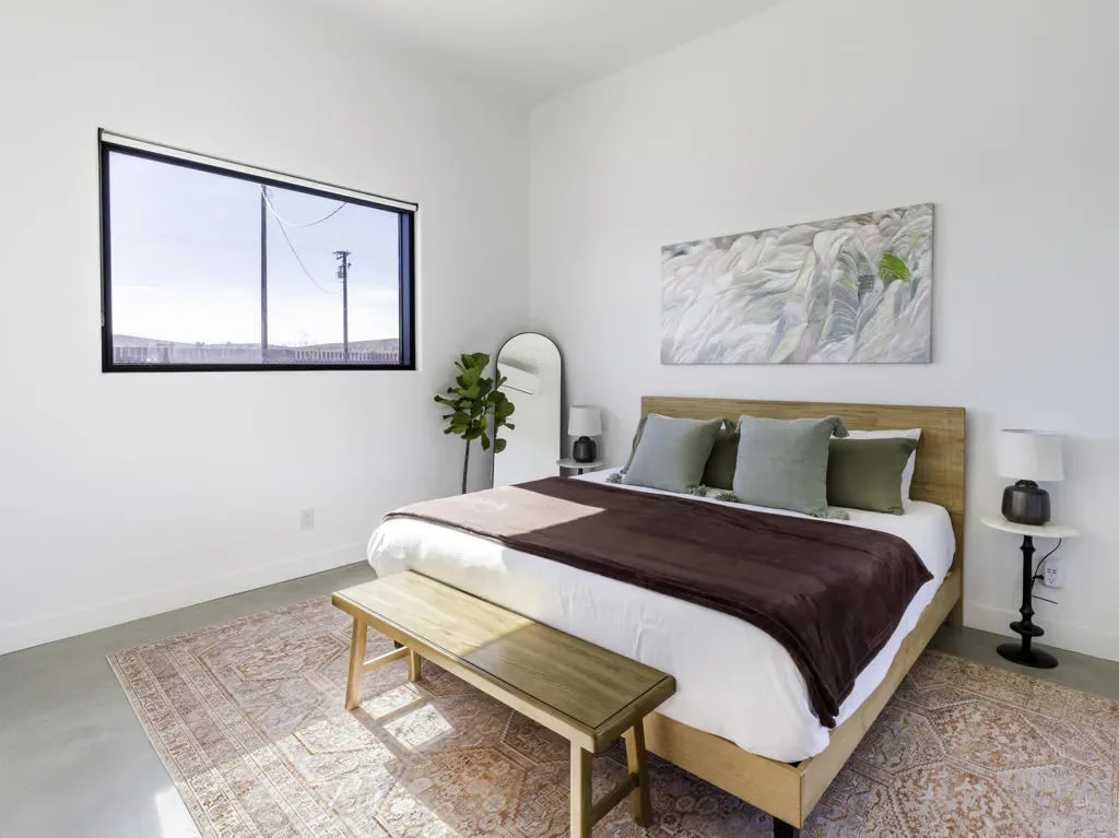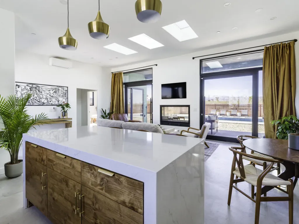 ”The G.O.A.T. at Goat Mountain offers a rare opportunity to own a private High Desert retreat set on approximately 5 acres of pristine land with sweeping views and complete seclusion–no neighboring properties, just open sky and natural beauty. This newer, architecturally refined home blends modern luxury with effortless comfort. A covered front porch opens to an elegant open-concept layout featuring a gourmet kitchen with waterfall quartz countertops, open shelving, statement lighting, and seamless flow into the family room. A striking two-sided indoor/outdoor fireplace anchors the space, while expansive custom glass pivot doors frame breathtaking desert views and enhance indoor-outdoor living. The private primary suite is a serene escape with a spa-inspired bath, soaking tub, walk-in shower, and double vanity. Two additional bedrooms are located in a separate wing and share a beautifully designed full bath. Outdoor living is elevated with a rooftop deck ideal for stargazing, a custom pool and spa, and a thoughtfully designed back porch perfect for relaxing or entertaining. Property features include fully owned solar, EV chargers, and a cement pad intended for a future tiny home addition, located on the rear of the property with water already run and easy connection to existing septic and power. Under San Bernardino County zoning, this nearly 5-acre property allows for expansion and qualifies for two short-term rental permits. The home is currently an active, successful short-term rental, offering both lifestyle and income potential. A rare blend of privacy, luxury, and opportunity–this is more than a home, it’s a destination.”