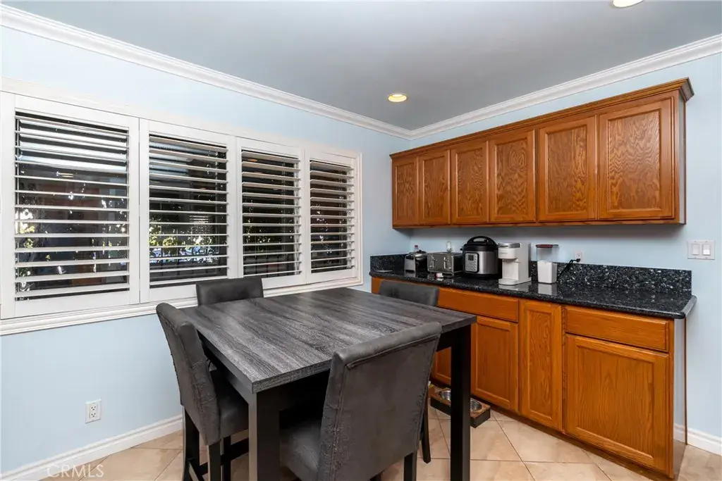 The thoughtfully designed kitchen offers both durability and convenience, featuring solid wood cabinetry, Blue Pearl granite countertops, a double-door refrigerator, stove, dishwasher, microwave, water filtration system, and a side bar with additional storage.
