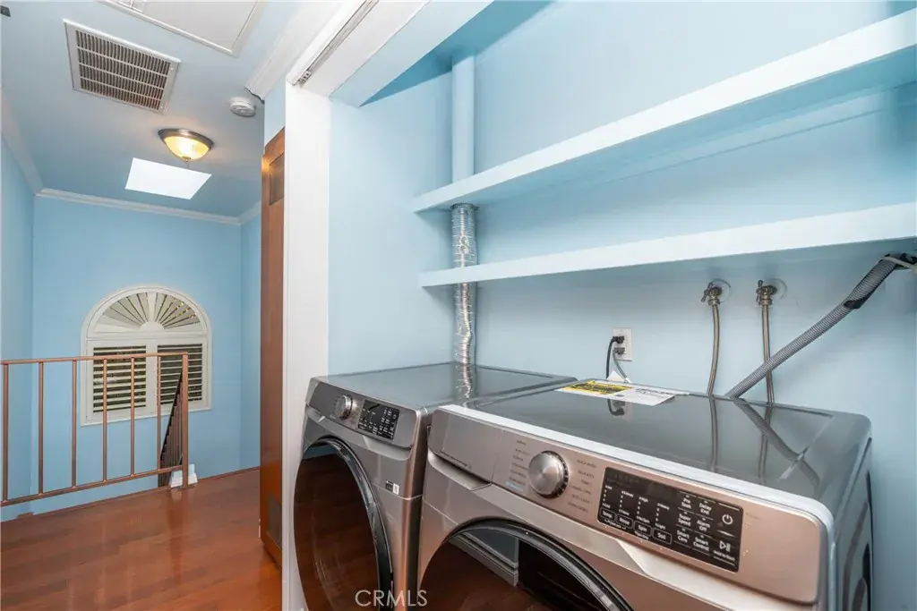 The upper level also provides generous linen storage and a dedicated washer and dryer area. A steel staircase leads to a large attic, offering abundant additional storage space.