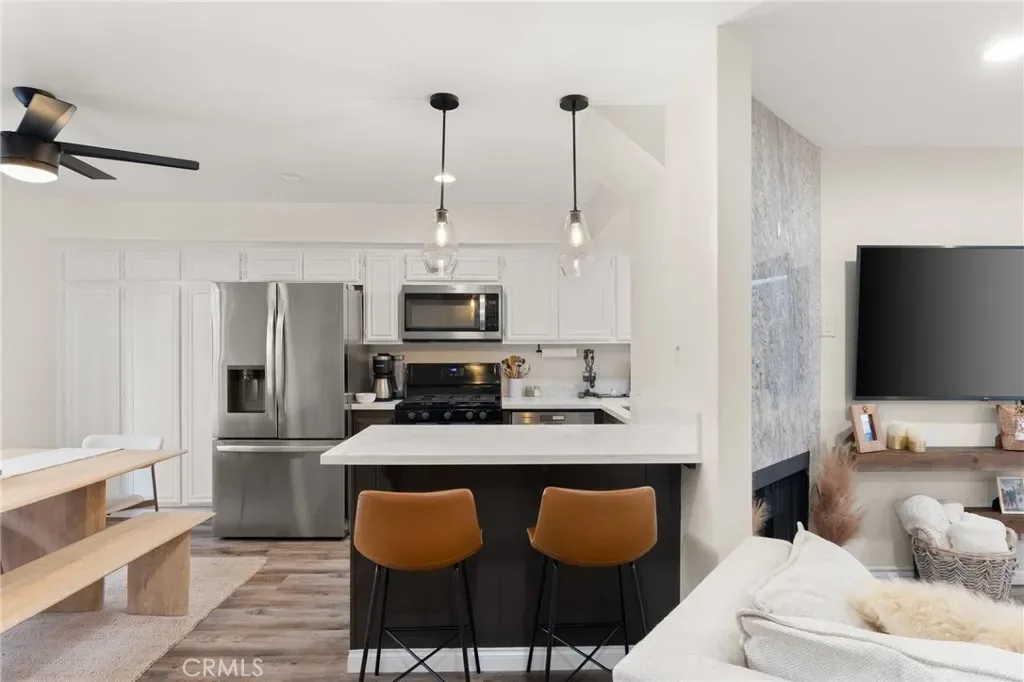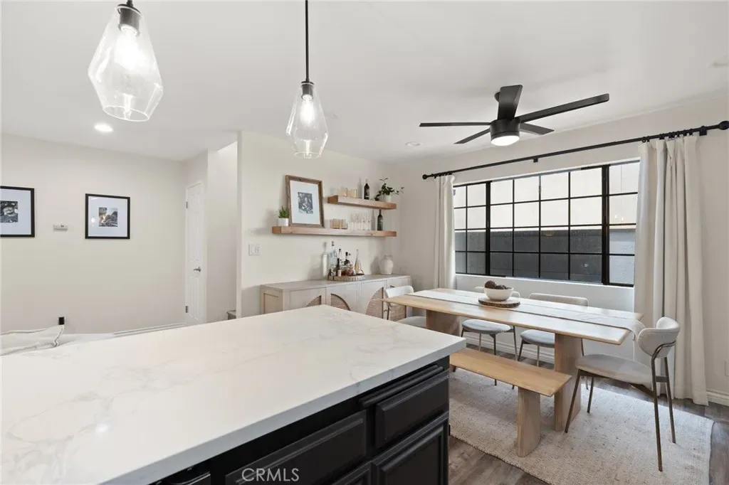 The fully upgraded kitchen is the true centerpiece of the home, showcasing a sparkling quartz island, stylish pendant lighting, stainless steel refrigerator, wine fridge, and a new sink and fixtures. Designed for both everyday living and entertaining, this modern space flows seamlessly into the dining area, where an oversized window fills the room with soft natural light.