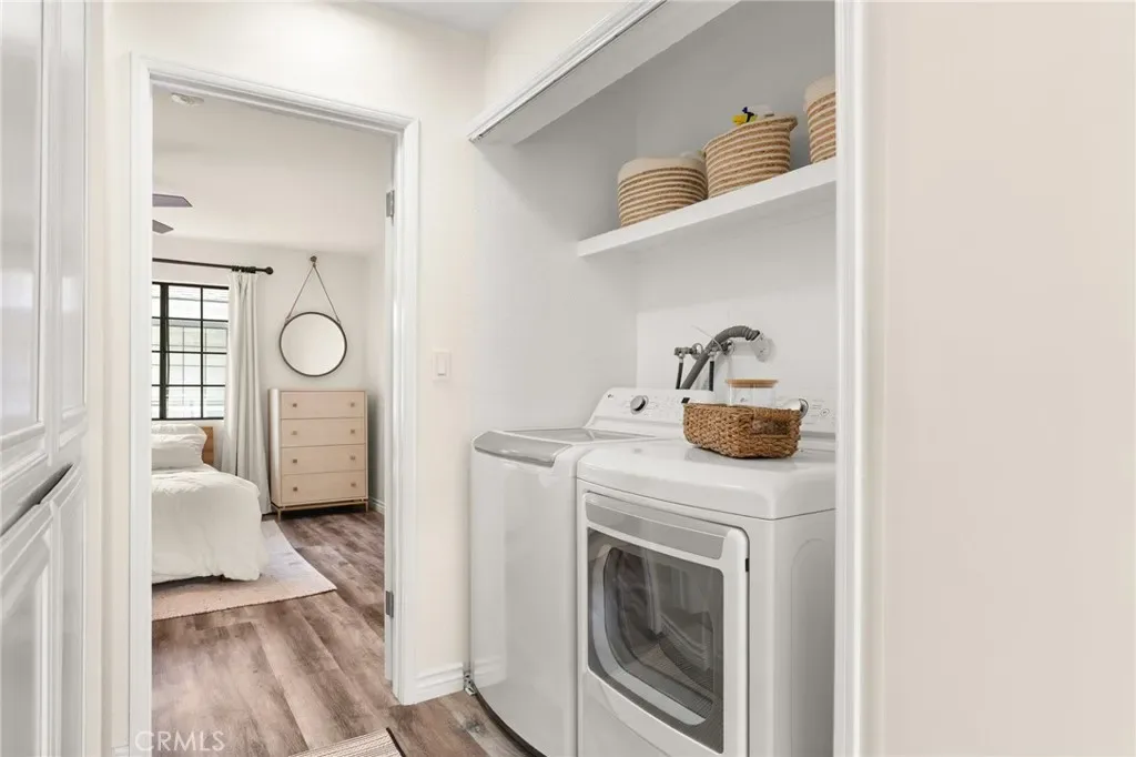 Upstairs, charming architectural details like arched windows add character, while the convenient in-hall laundry provides everyday ease. The primary suite feels like a private retreat, featuring a spacious walk-in closet, private balcony, and an updated Jack & Jill en-suite bath complete with a new vanity, modern lighting, and a sleek new shower enclosure. The secondary bedroom is generously sized with ample closet space and sliding doors for flexible use as a bedroom, office, or guest space.