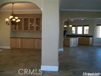 The gourmet chef’s kitchen is designed for serious culinary use, appointed with granite countertops, oversized island with pendant lighting, recessed lighting throughout, 6-burner range with stainless Wolf vent hood, stainless sink, garbage disposal, three dishwashers, and an expansive walk-in pantry. The adjacent dining area features a chandelier and custom china hutch with buffet counter.