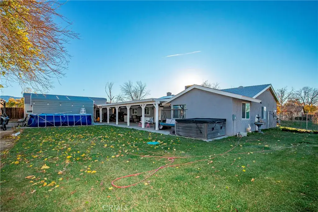 Welcome to this charming ranch-style single-level home. Built in 1990, this well-maintained 4-bedroom, 2-bathroom residence offers approximately 1,771 square feet of comfortable living space on a spacious half-acre lot—perfect for those seeking room to breathe in the beautiful high desert of the Antelope Valley. Paid off solar panels and tankless water heater makes this home energy efficient and new roof placed in 2018. Step inside to discover a recently renovated kitchen, new 8 burner stove, new dishwasher, drink fridge with coffee area, and 9 ft island that overlooks the living room. Tile flooring throughout provides easy cleanup. The inviting layout features 4 spacious bedrooms and 2 baths with new vanities, and ample natural light. The generous lot provides endless opportunities and has a covered RV parking area with 30 amp service, 2 large containers, a covered workshop with 220 volt ideal for welder/air compressor, outdoor shed, a play-set, jacuzzi, above ground pool, and large covered patio with alley access.