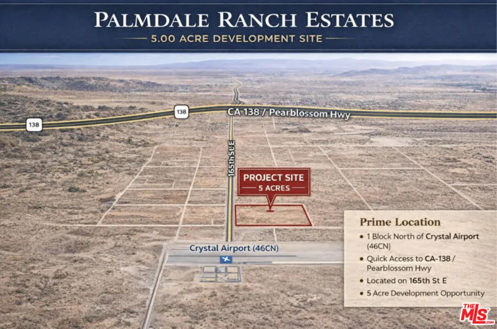 PURCHASED AT $150,000.00 IN 2007. ZONED: LCRA 12000 *SUBDIVISIBLE 12,000SF PER LOT PER HOME PLUS ADU(POSSIBLE) TOTAL LOT SIZE 204,035 SF YOU CAN BUILD TOTAL OF 34 HOMES AMAZING LOT!! UNLIMITED POTENTIAL!! Latitude 34.488376 Longitude -117.834186 DEVELOPMENT OPPORTUNITY PALMDALE, CA Acquisition History Purchased in 2007 for $150,000 PROPERTY DETAILS Zoning: LCRA 12000* Total Lot Size: 204,035 SF (~4.68 Acres) Subdivision Potential: Minimum 12,000 SF per lot Single-Family Homes + ADU potential per lot?? DEVELOPMENT POTENTIAL Estimated Build: Up to 17 Homes (Buyer to verify with City)ADU potential provides additional income per lot Flexible development strategy: Build & sell (for-sale product) Build & hold (rental portfolio) Phased development LOCATION Coordinates: Latitude: 34.488376 Longitude: -117.834186 Located in Palmdale growth corridor with ongoing residential expansion and increasing housing demand. INVESTMENT HIGHLIGHTS Large 4.68-acre parcel with subdivision capability Strong value-add through land entitlement and development Ability to create multiple income streams (homes + ADUs)Attractive price basis vs. development upside Ideal for builders, developers, and long-term land investors POSITIONING (THIS IS IMPORTANT) Rare large-lot subdivision opportunity with the ability to create a 30+ unit residential project in a growing Palmdale market. (Professional Add-On) Buyer to verify zoning, density, subdivision, and development feasibility with City of Palmdale Infrastructure (utilities, grading, access) to be confirmed STRONGER BUYERS “One of the few remaining large parcels in Palmdale offering subdivision scale with ADU upside positioned for both for-sale development and long-term rental portfolio creation. “MOST OF THE SUBDIVISIONAL LANDS ARE EITHER 1 ACRE PER HOME OR 2.5 ACRE PER HOME. THIS ONE IS 12,000 SF PER HOME