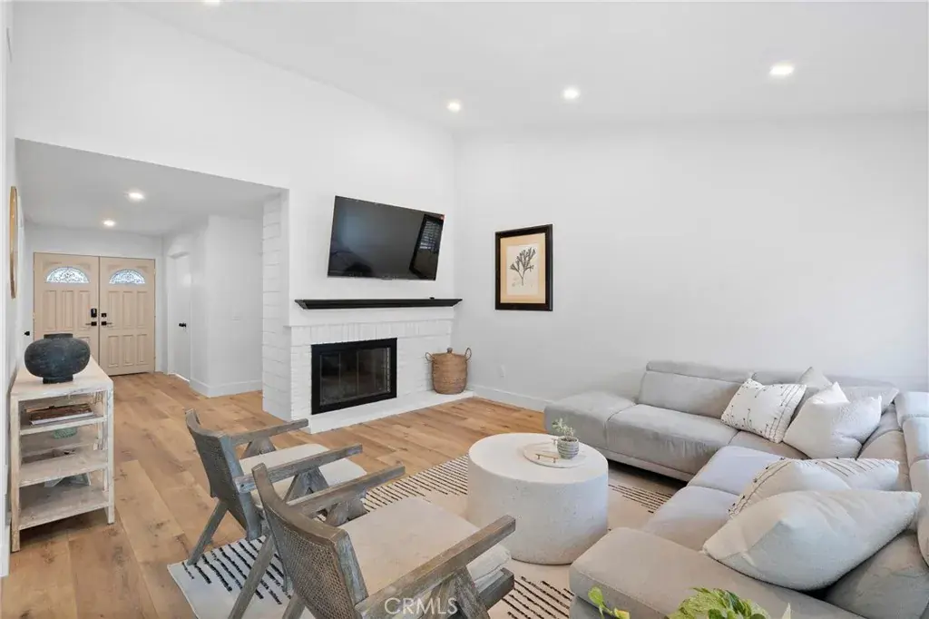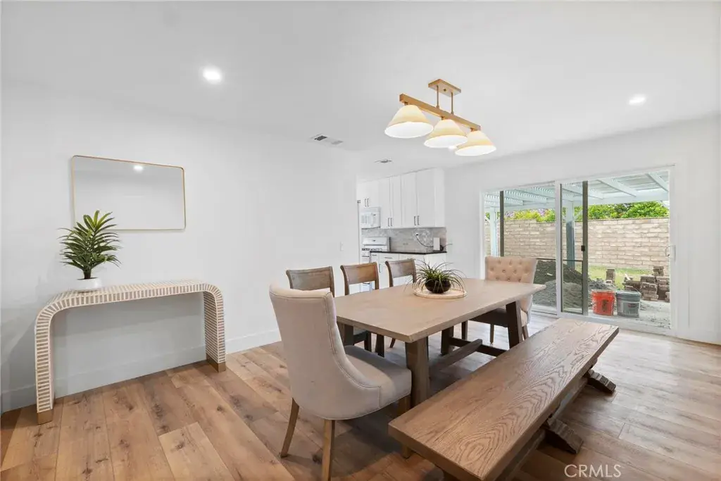 The remodeled kitchen includes custom cabinetry, quartz countertops, a breakfast nook, and plenty of natural light. A large family room sits just off the kitchen, complete with comfortable furnishings, a large LED TV, and sliding doors that open to a private backyard and grassy area—great for relaxing or entertaining.