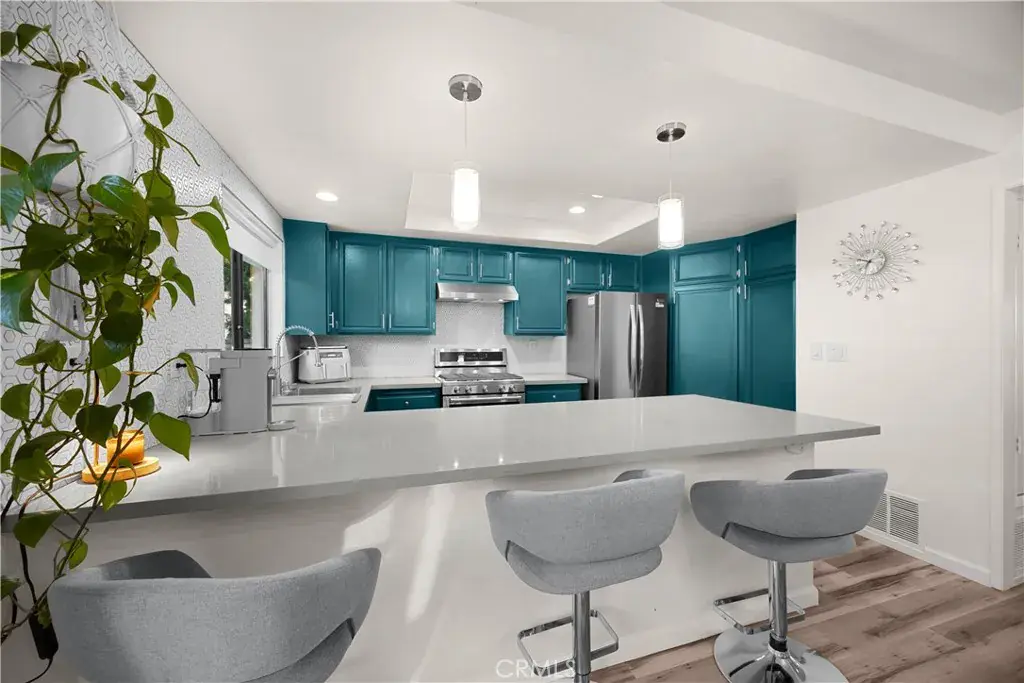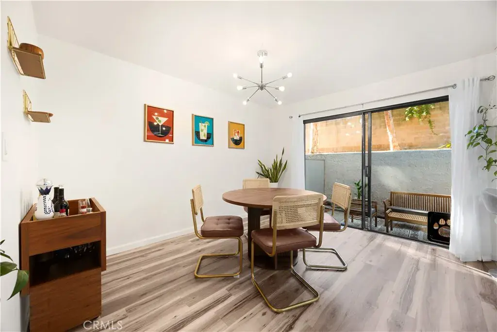 The dining area showcases a contemporary light fixture and plank flooring, with large sliding glass doors leading to your private patio—perfect for entertaining or relaxing outdoors. The open, modern kitchen is a true highlight, offering quartz countertops, a breakfast bar, stainless steel contemporary appliances, pantry, and abundant cabinetry. Stylish pendant lights over the breakfast bar and recessed lighting complete this beautifully designed space. The main level also includes a convenient guest bathroom.