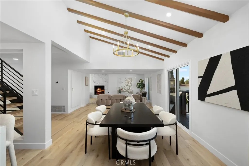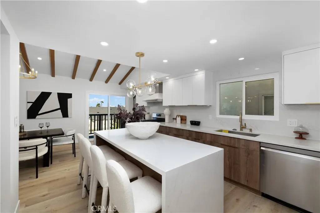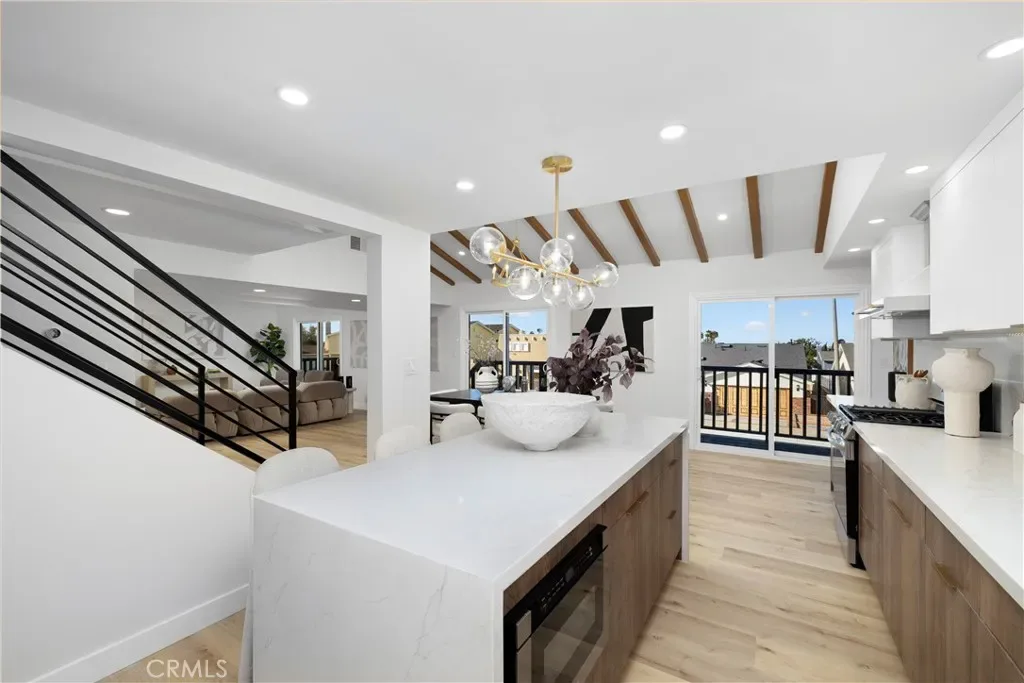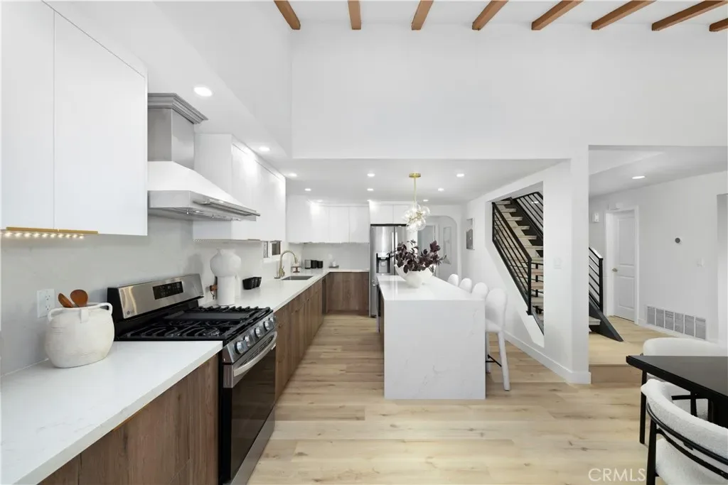 Spanning an impressive 2,541 sq ft, the open-concept main level captivates with soaring vaulted ceilings and exposed wood beams. The heart of the home is a chef’s dream kitchen, featuring sleek two-tone custom cabinetry, premium quartz countertops, and a striking waterfall island that serves as a natural gathering spot. The seamless flow into the living and dining areas creates an expansive space perfect for hosting grand gatherings or intimate evenings.