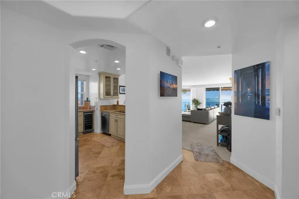 This ocean-facing corner residence offers unobstructed, panoramic views of the Pacific from nearly every living space. The open-concept layout is designed for both convenient everyday living and entertaining, with open flow between the living, dining, and kitchen areas, all framed by expansive windows and sliding glass doors that capture views of the ocean, Catalina Island, Thums Islands, the marina, the Queen Mary, and the coastline beyond.
