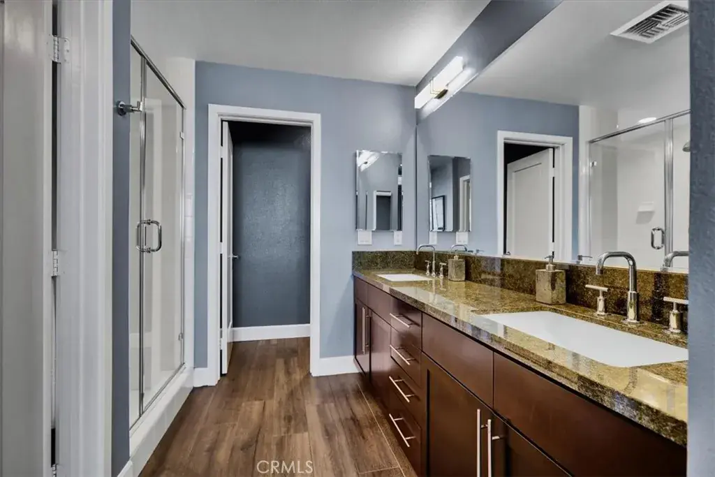 The primary suite is generously sized and includes a spa-inspired bathroom with dual sinks, a large walk-in shower, and ample closet storage. The secondary bedroom and bathroom are thoughtfully positioned to provide privacy for guests or additional household members. Additional features include in-unit laundry, central heating and air conditioning, and secure parking in a gated garage with plenty of guest parking.