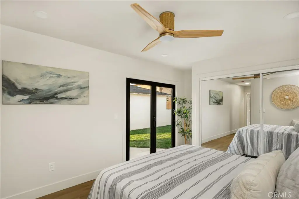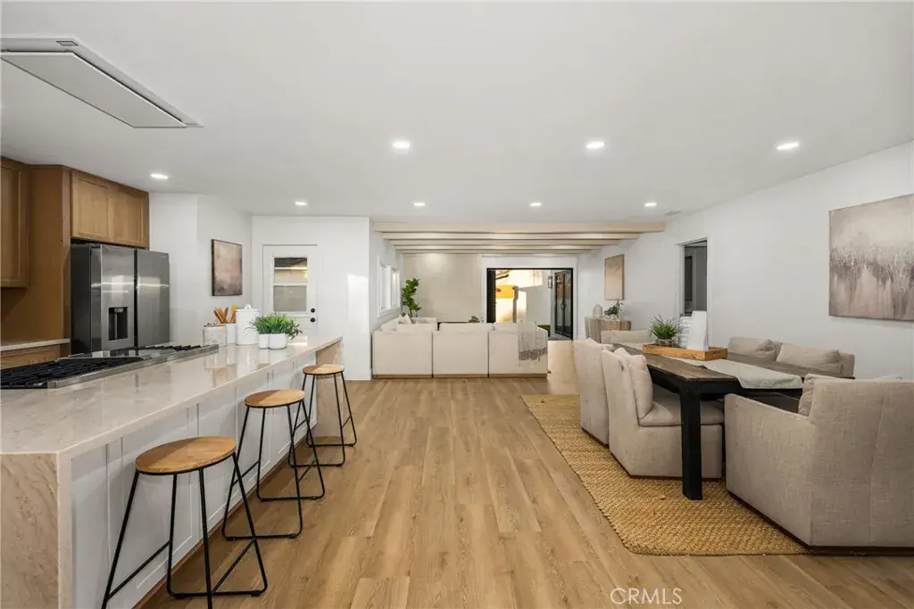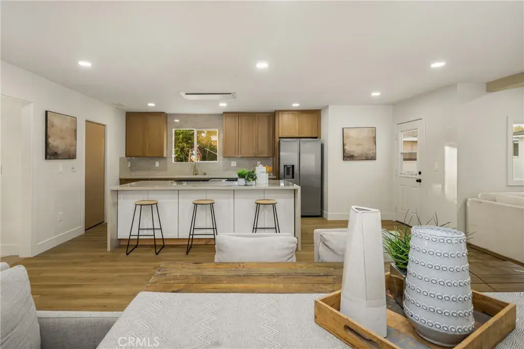 This home is absolutely stunning! Remodeled with permits and thoughtfully designed from the inside out. With landscaping in the front and backyard, a finished two-car garage, and a large driveway, the exterior alone has pride of ownership. Welcome inside, where the entryway with its gorgeous tile, vast mirror, and an excellent option for a work-from-home room off the entryway, including large windows for natural light. The remodeled kitchen has an expansive island with storage on both sides, quartz countertops, soft-closing drawers & cabinets, recessed lighting, and, right off the kitchen, a laundry room with cupboards and a counter for the dream laundry space. The kitchen opens to the dining space and the warm, inviting living room with beams, a fireplace, and folding doors that complement the space at any time of day or night. On one side of the home, there are three bedrooms, a linen closet, and a beautifully designed bathroom. On the other side of the house is your primary suite, a retreat with two closets, an open bedroom, folding doors to the yard, and a modern primary bathroom.