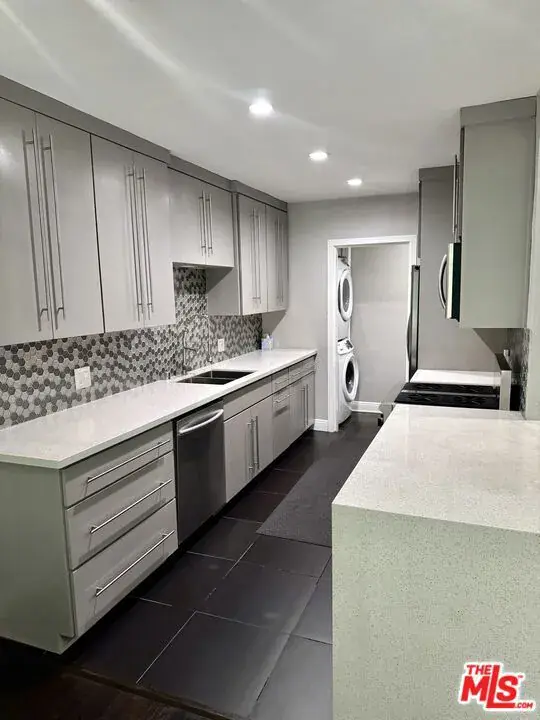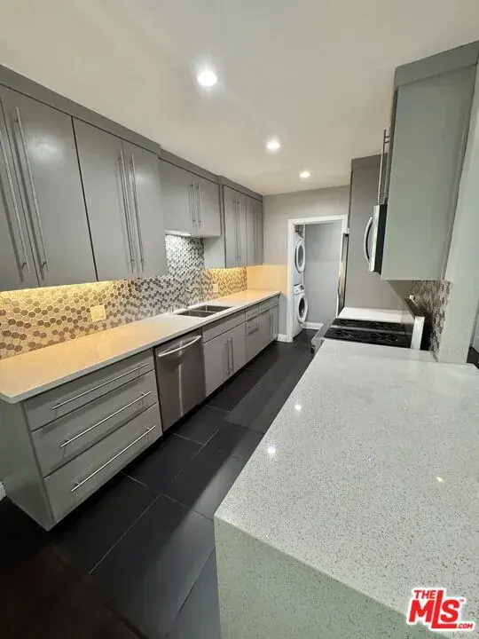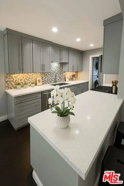 Welcome to this beautifully designed modern residence where luxury meets comfort. Bathed in natural light, this meticulously maintained home features a thoughtful open layout, rich hardwood floors, and sophisticated finishes throughout. The inviting living area showcases a neutral designer sofa, brass accent tables, and a sleek glass coffee table, perfect for relaxing or entertaining. The gourmet kitchen boasts gray cabinetry, quartz countertops, a hexagonal tile backsplash, stainless steel appliances, and a functional island with seating, plus an in-unit washer and dryer for added convenience. The dining area offers an intimate setting beneath a statement light fixture, enhanced by curated artwork and subtle greenery. The tranquil bedroom features a plush platform bed, elegant nightstands, and expansive windows with privacy treatments. A spa-inspired bathroom completes the space with a marble vanity, brushed gold fixtures, and a serene, hotel-like atmosphere. This turnkey, design-forward home is available now for lease offering refined style and everyday comfort in a prime location.