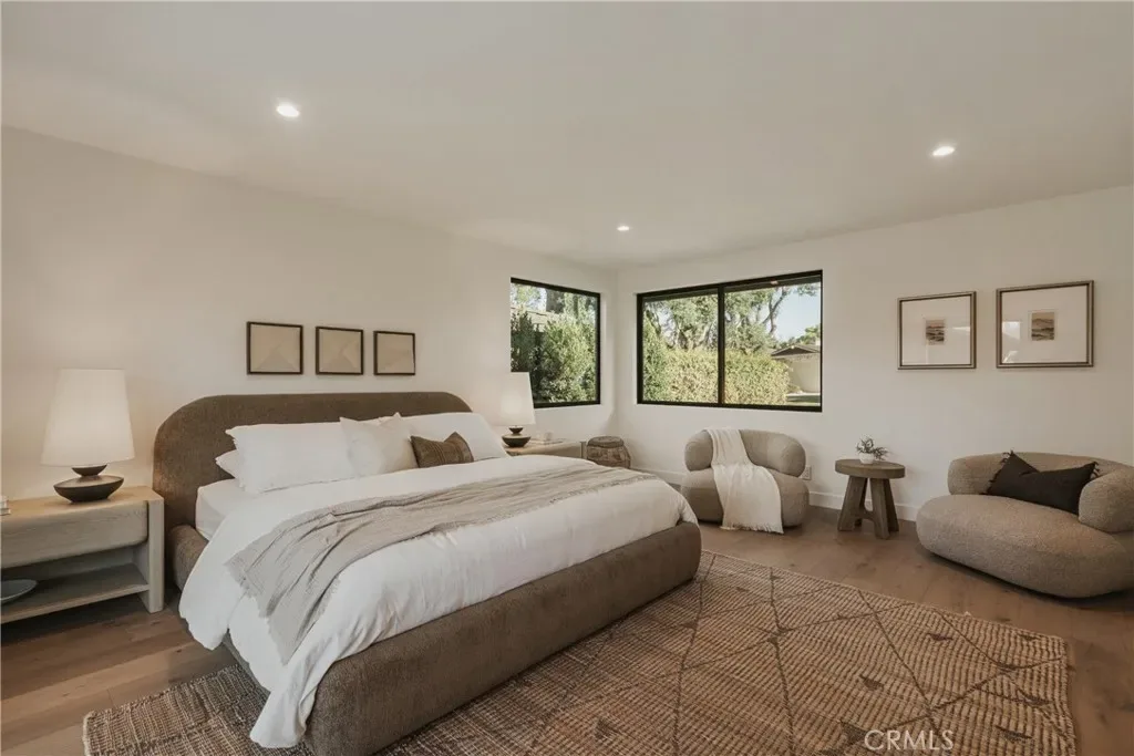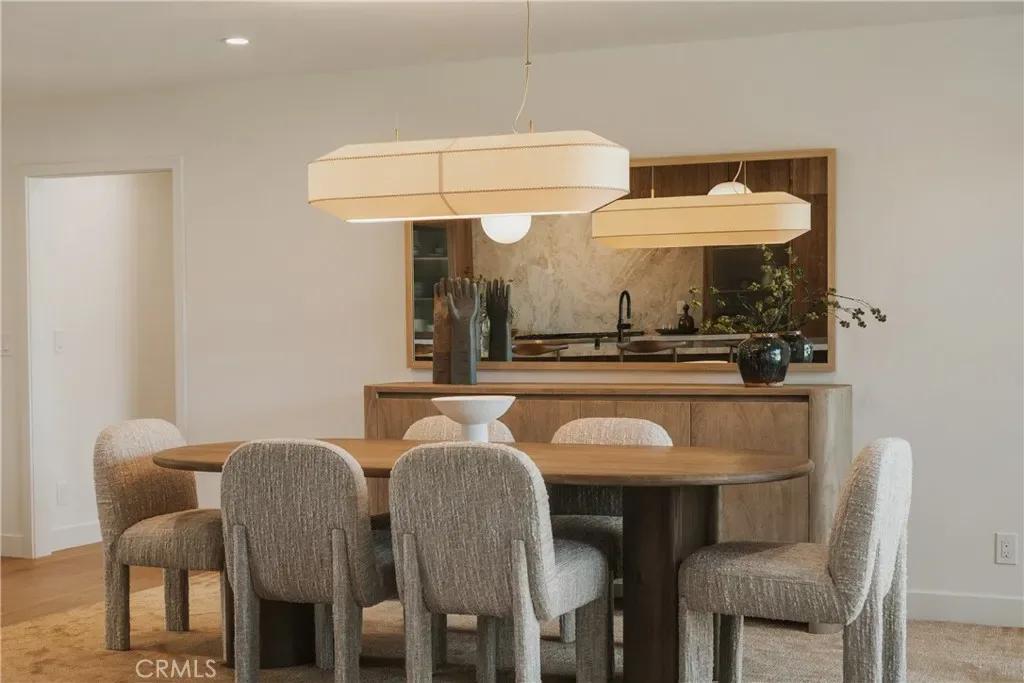 The main home spans approximately 3,066 square feet with four bedrooms, three bathrooms, a fireplace, and an attached three-car garage. Interiors are anchored by Chêne engineered wood flooring throughout and a warm, curated palette featuring Sherwin Williams Westhighland White walls, limewash accents, and designer lighting selections that elevate every space. The living room is centered around a statement fireplace clad in Bedrosians matte porcelain tile and complemented by sculptural lighting and custom finishes.