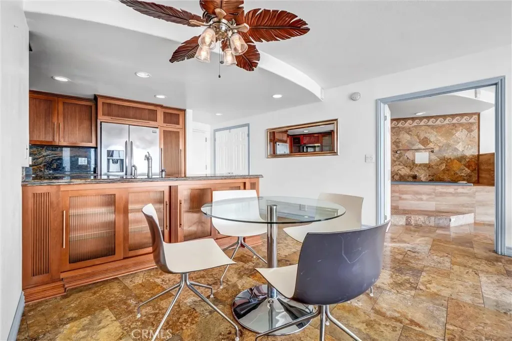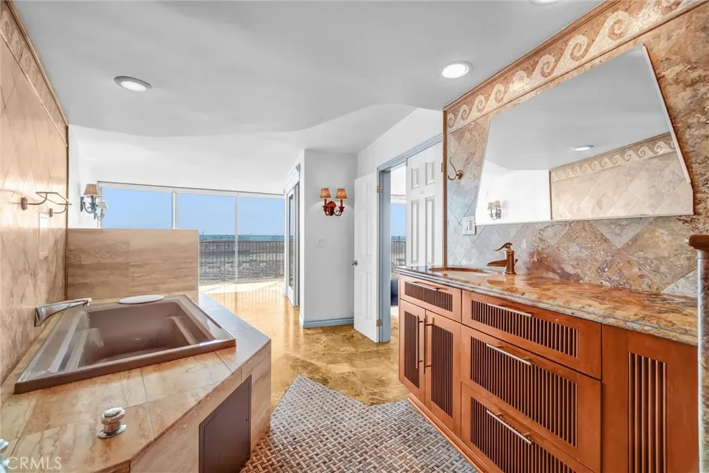 This beautifully maintained 1-bedroom, 1.5-bath residence features high-quality finishes throughout, including custom cabinetry with intelligent soft-close doors and expanded storage, granite countertops, stainless steel appliances, and timeless travertine flooring. The primary bathroom showcases artistic designer ceramic tile work. Floor-to-ceiling sliding glass doors maximize natural light and frame the spectacular ocean views, while an easy-to-operate shade system lets you adjust the light for comfort and ambiance. The spacious bedroom includes a custom closet and mirrored accents.