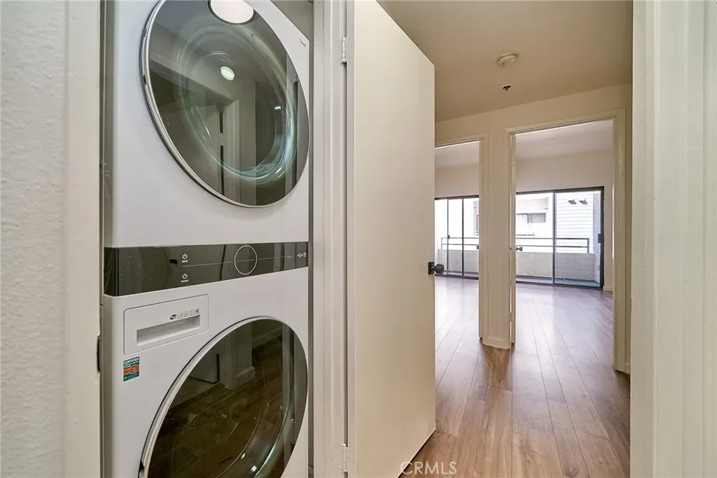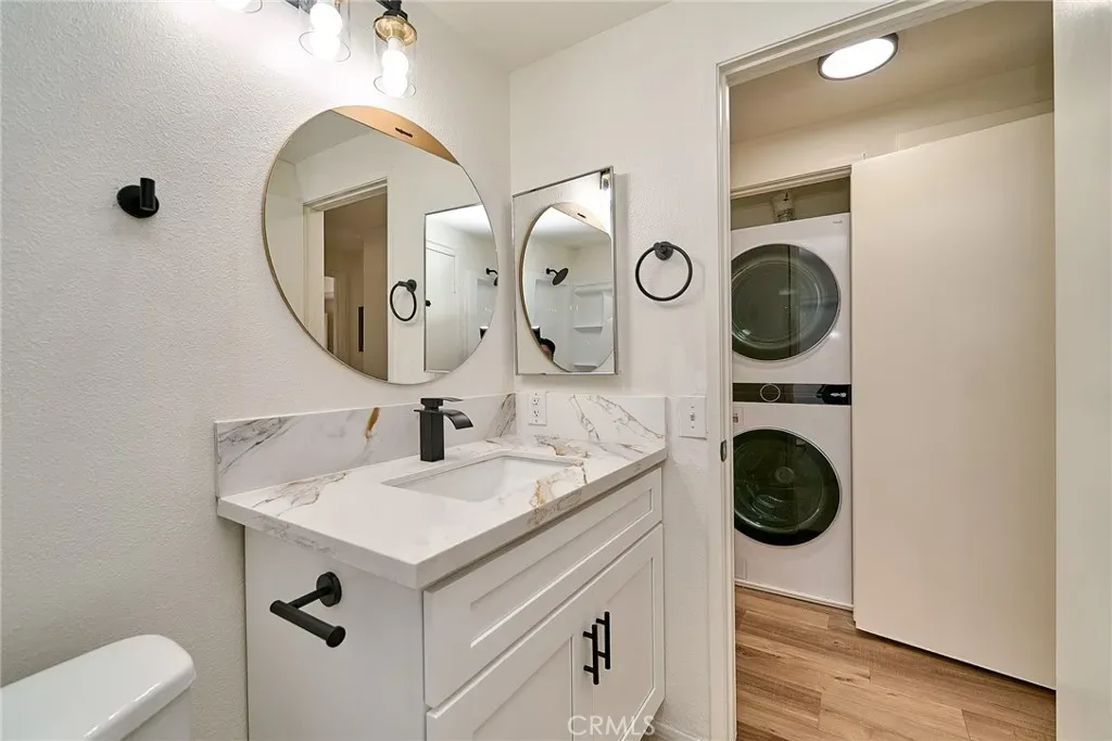 The spacious living room flows into the upgraded kitchen, featuring new quartz countertops, stainless steel appliances, and a new sink and faucet. Both bathrooms have been tastefully remodeled, and the home includes fresh interior paint and natural wood-design laminate flooring throughout. The hallway laundry area conveniently includes a newer stackable washer and dryer, neatly tucked away.