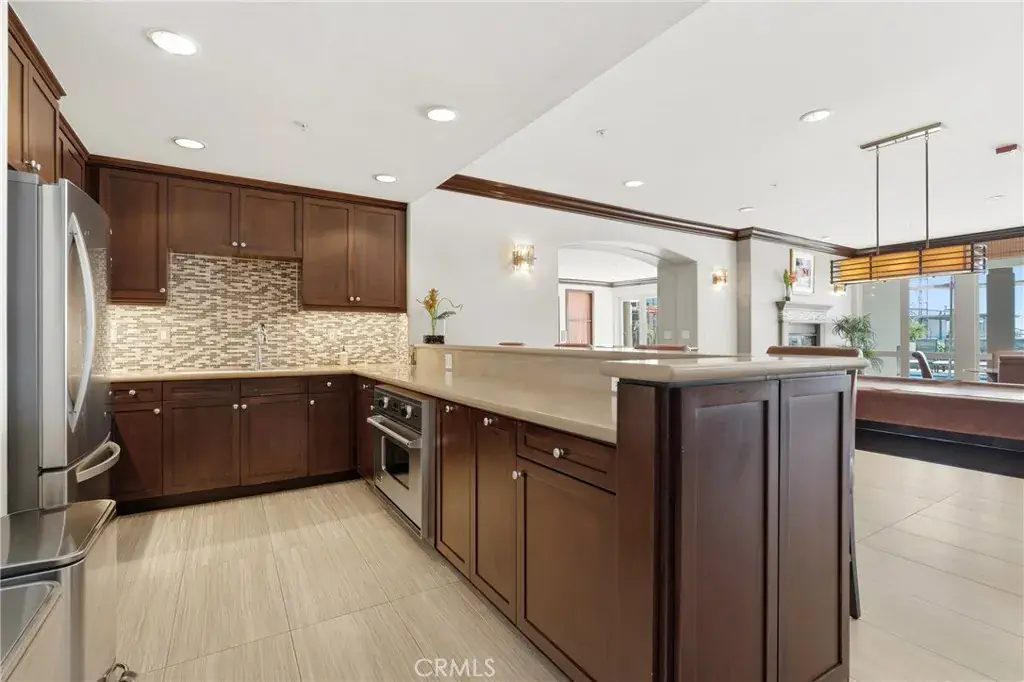 The open-concept layout is ideal for both relaxing and entertaining. A well-appointed kitchen with stainless steel appliances including a new refrigerator offers abundant counter space, a center island with sink, breakfast bar, and flows seamlessly into the dining and living areas, complete with a fireplace and additional floor-to-ceiling glass doors leading to the balcony. Neutral paint tones and upgraded ceiling light fixtures with fans enhance the inviting interior. Property comes with new in-unit washer and dryer to add to the everyday convenience.