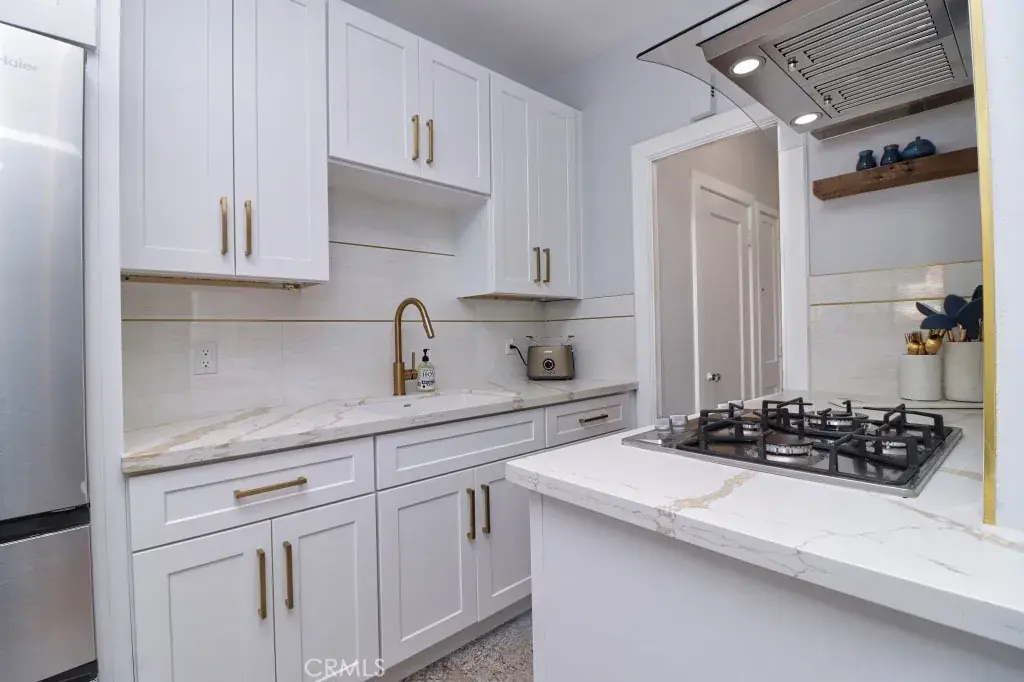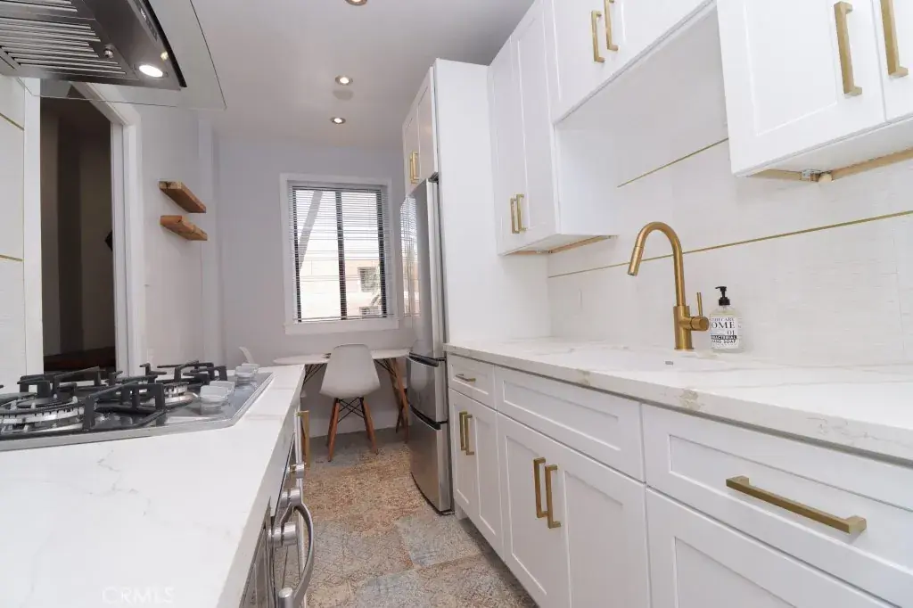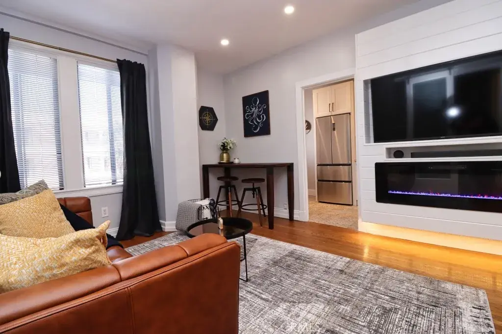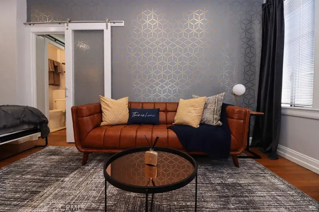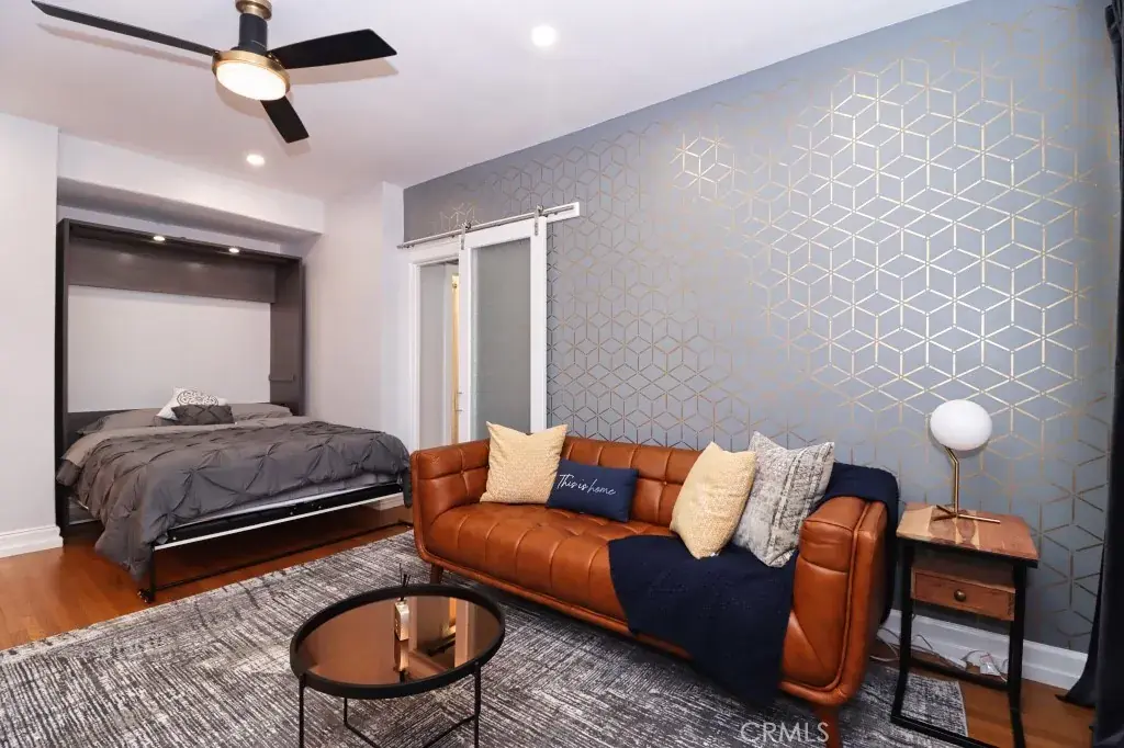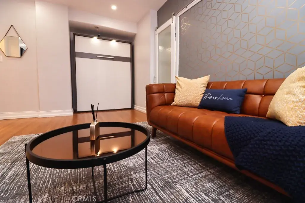 Offered fully furnished, the home includes a queen Murphy bed, a sophisticated leather sofa, and a stylish dining area designed for both everyday living and entertaining. The thoughtfully equipped kitchen, complete with modern appliances, silverware, and a sleek coffee station, delivers both convenience and understated luxury.
