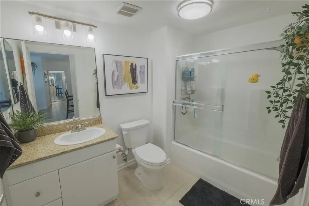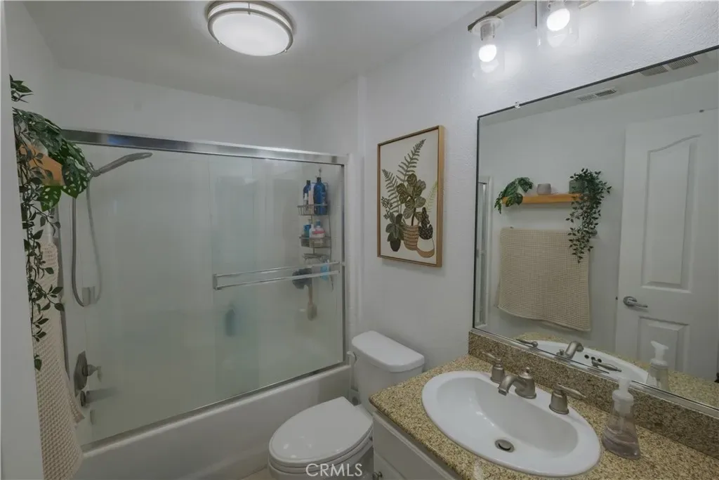 This unit includes a private patio, one of a limited number of units in the building with this feature. The primary bedroom offers dual closets and direct access to the patio. Additional features include an in-unit washer and dryer.