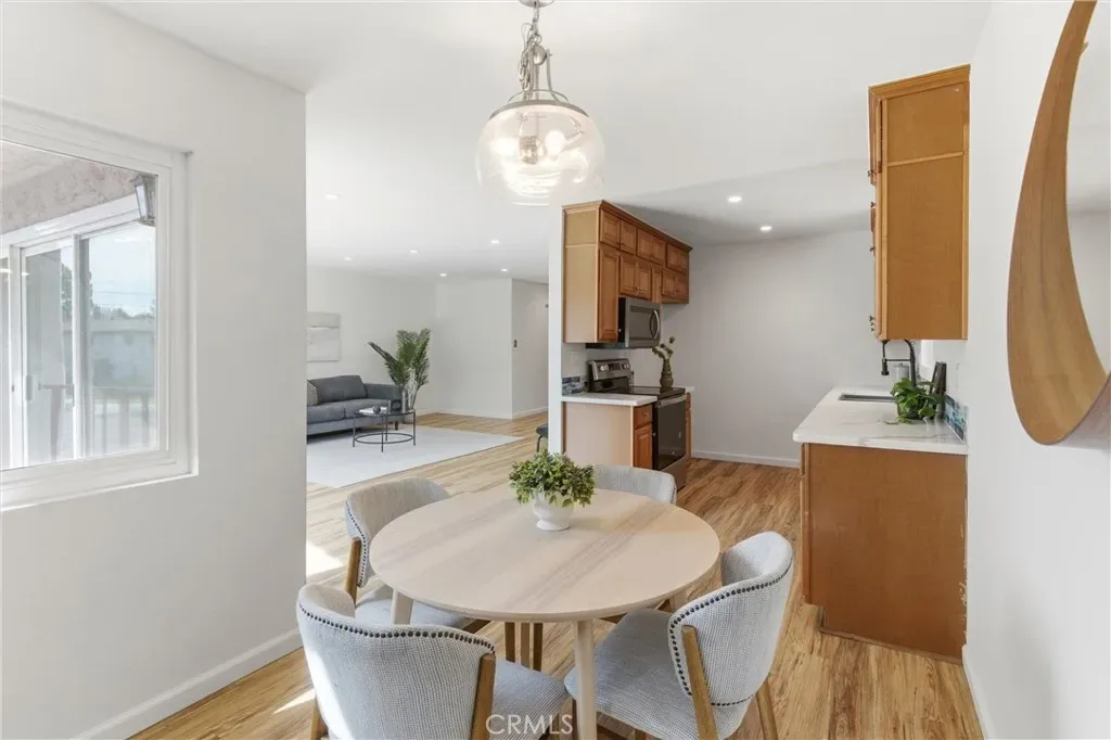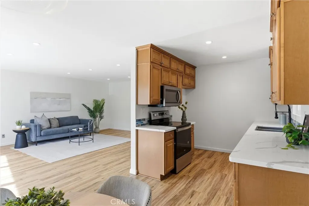 Imagine a life of sunshine, gentle breezes, swaying palm trees, waves cresting, and breaking on the shore. Awake to the knowledge that you are living your best life just two blocks from the Pacific Ocean. Welcome to the historic Belmont Heights enclave, a very walkable neighborhood with a strong community feel, close to Bluff Park and Junipero Beach. Nearby Belmont Shore, with its shops, restaurants and cafes offers a lifestyle of ease and comfort. Now, open the door to 3609 East 2nd Street #207. Cross the threshold. Step inside. That smile is your assurance of the good times to come. The foyer features an expanse of mirrored closet doors. Keep stepping. The view that beckons is the reward of living on the second floor overlooking the city life below. Floor to ceiling walls of glass doors slide open with an invitation to sip morning java on the balcony or appreciate the glittering lights in the nighttime sky. Natural light fills every space and illuminates the gleaming, wood laminate floors to glide your partner to experience the joys of art, music and literature in the spacious living area. Raise a glass and celebrate your good fortune with every tasty meal in the dining nook adjoining the kitchen. Expansive white, marble countertops with custom design, blue backsplash, abundant cabinets, all new (2023)Whirlpool appliances, including a self-cleaning electric range, built-in stainless steel microwave, and a stainless steel, top control, dishwasher are highlights of the kitchen.