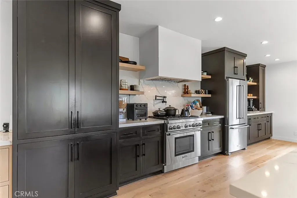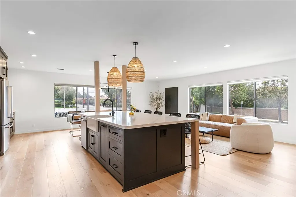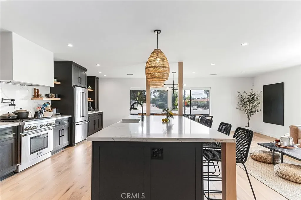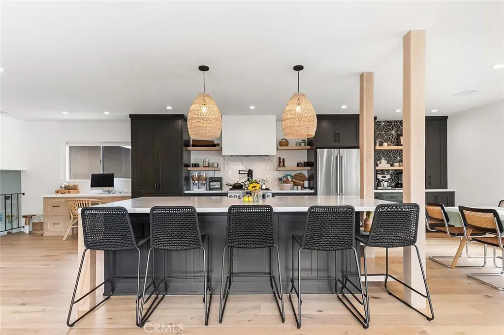 Perfect home for buyers who value design and entertaining. Mid-Century Modern Sophistication in Alamitos Heights with the perfect harmony of timeless architecture and contemporary luxury in this meticulously renovated split-level gem. Situated on a prominent corner lot, this residence is a masterclass in Mid-Century Modern design. At the heart of the home lies a true Chef’s Sanctuary: a sprawling open-concept kitchen featuring quartz countertops, custom cabinetry, and a professional-grade six-burner Thermador suite with a pot filler. Whether you’re hosting at the oversized breakfast bar or serving from the dedicated wine/coffee station, the seamless flow into the dining and living areas ensures you never miss a moment.