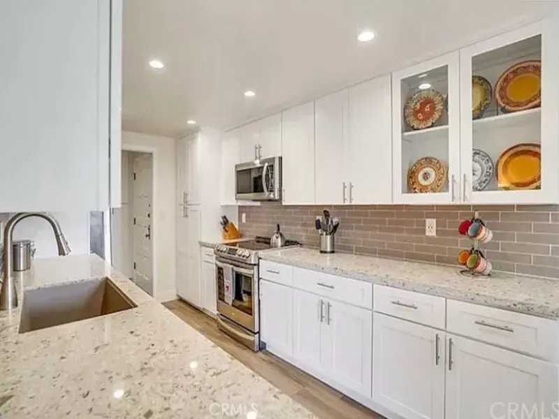 Step into this beautifully updated 2-bedroom, 2-bath condominium where natural light pours in through expansive sliding glass doors, leading to a private balcony with serene views of Bixby Park. The open-concept layout is designed for both comfort and style, featuring plank tile flooring throughout, sleek quartz countertops, white shaker cabinetry, and stainless steel appliances. The spacious primary suite includes a luxurious en-suite bathroom with dual sinks and a custom-tiled shower. Additional highlights include radiant heat, wall-mounted air conditioning, and a dedicated covered parking space.