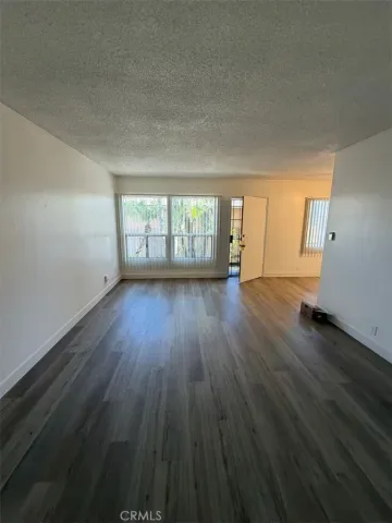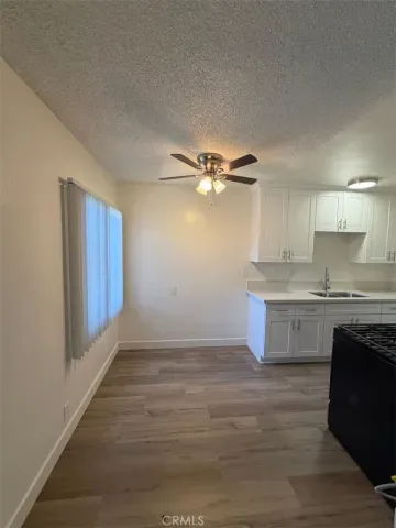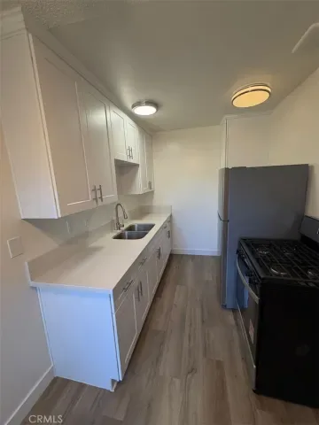 The completely renovated kitchen boasts brand-new shaker-style cabinetry paired with sleek quartz countertops, a stainless steel sink, and durable vinyl plank flooring. It comes fully equipped with a stainless steel stove/oven and refrigerator, creating a clean, contemporary space perfect for everyday living and entertaining.