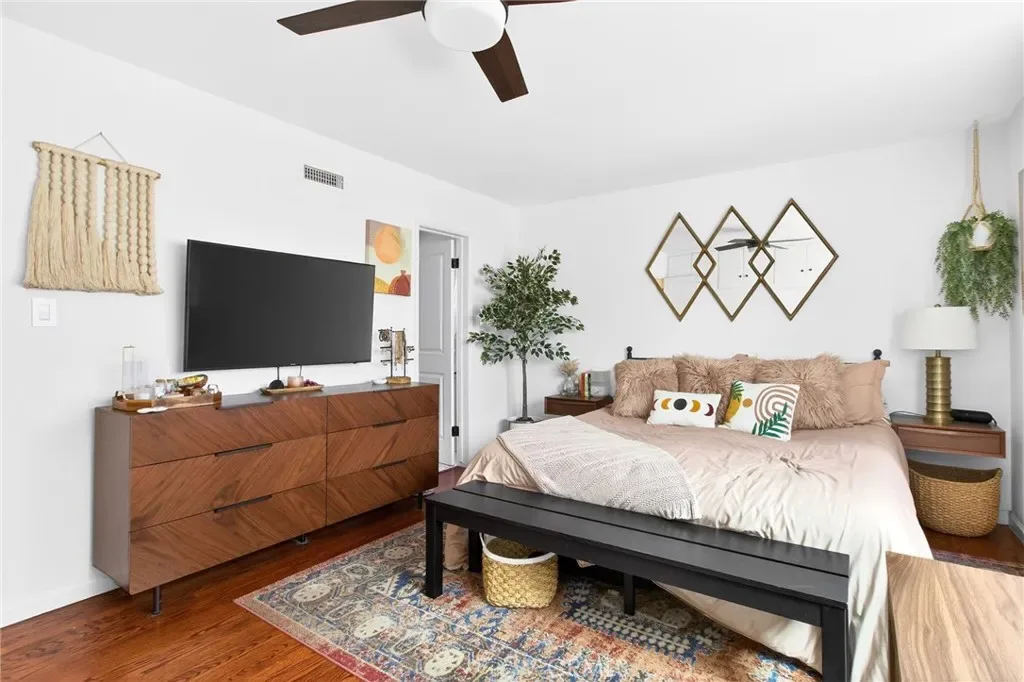 Step inside to find warm hardwood floors and a bright, airy living space highlighted by a stunning wall of windows that fills the home with natural light. Double-pane windows ensure peace and energy efficiency, and ceiling fans. The property has character throughout.