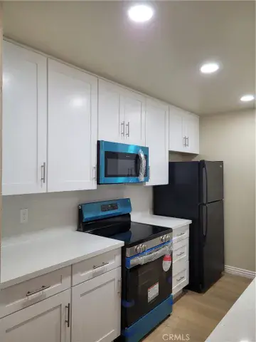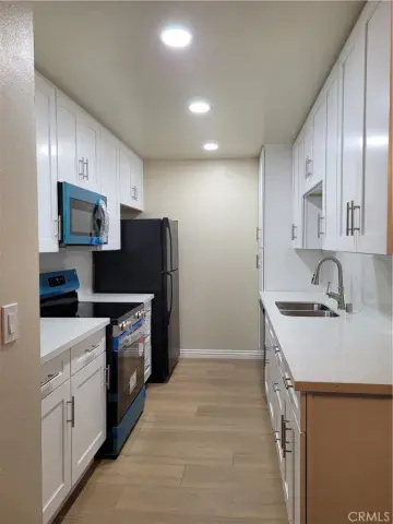 The updated kitchen is beautifully appointed with recessed lighting, quartz countertops and backsplash, stainless steel appliances, and crisp white shaker cabinetry. New vinyl flooring runs throughout the unit, adding a modern and cohesive touch. Two spacious closets provide generous storage.