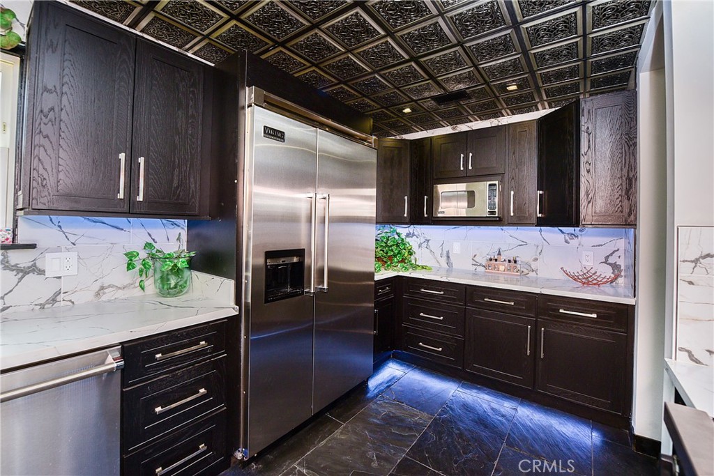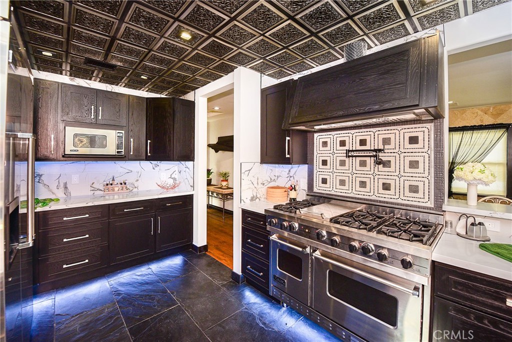 The chef’s kitchen stuns with a massive Athena Calcutta Quartz waterfall counter, custom white oak shaker cabinetry, professional Viking appliances, pot filler, bar-style cup washer, and integrated sound system — equal parts showpiece and powerhouse.
