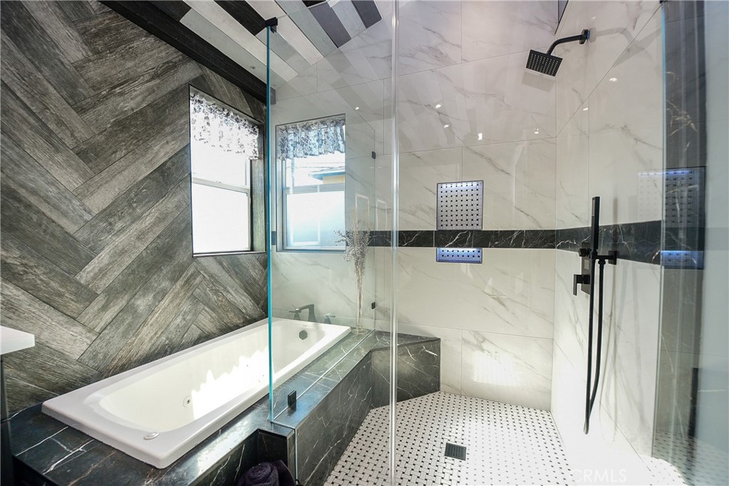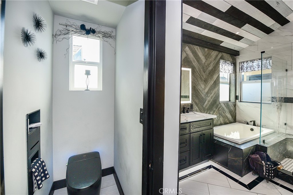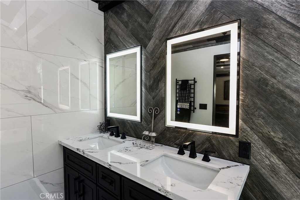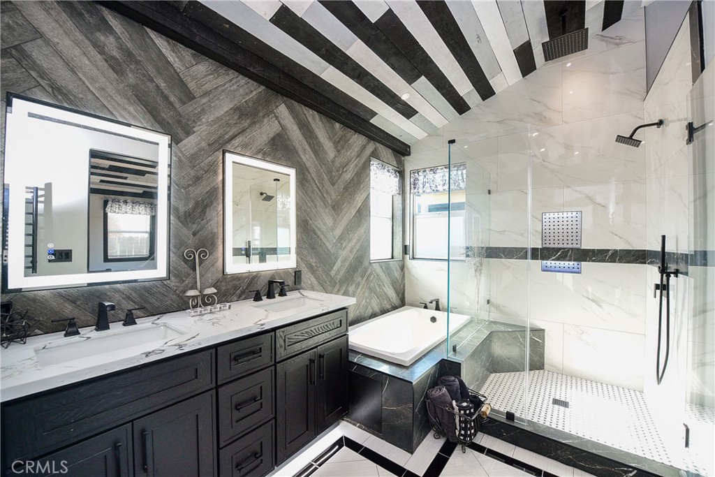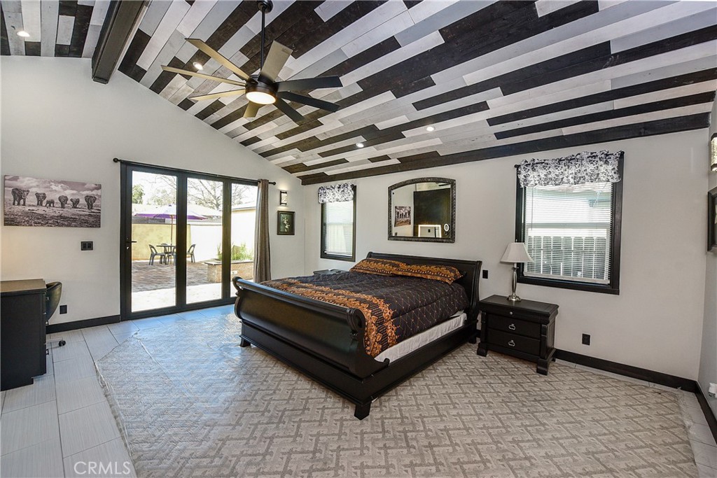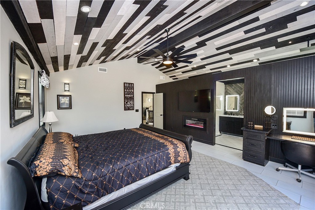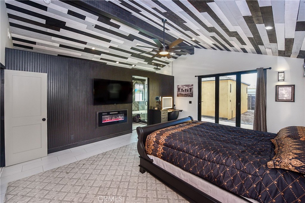 The crown jewel is the 500 sq ft Master Suite — a true private retreat with soaring vaulted wood ceilings, a sleek electric fireplace, and a massive 8-foot custom slider opening to the backyard. The spa bath features fog-free LED mirrors, a heated towel bar, and a high-tech walk-in shower with temperature and timer controls.