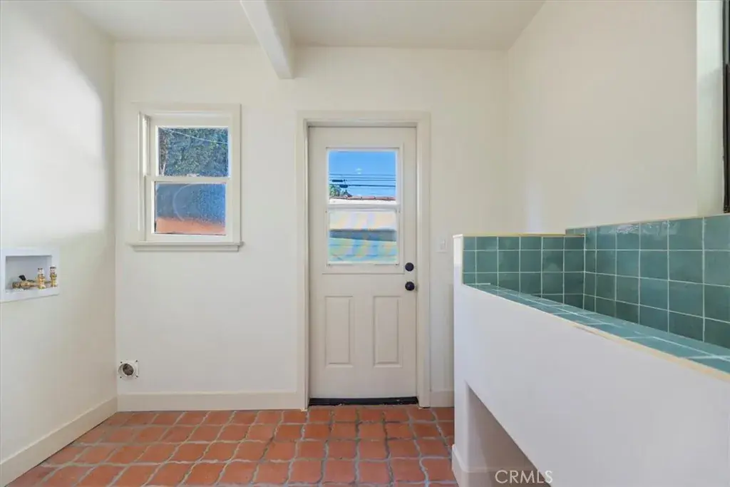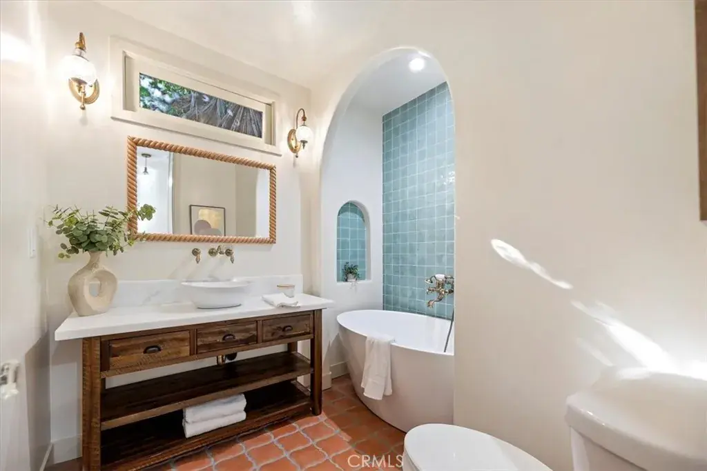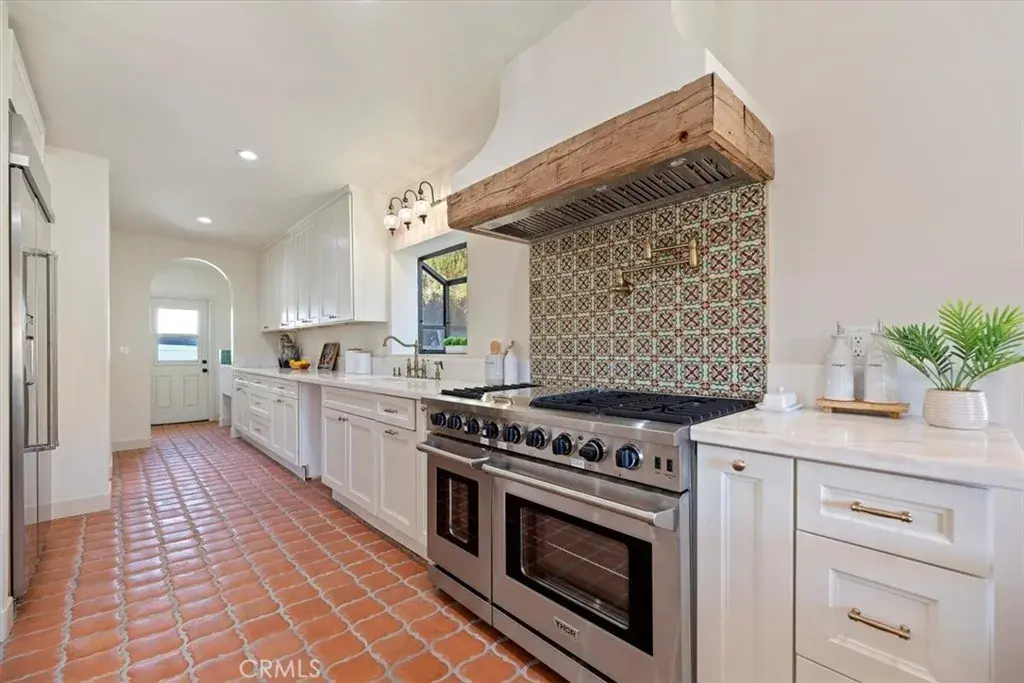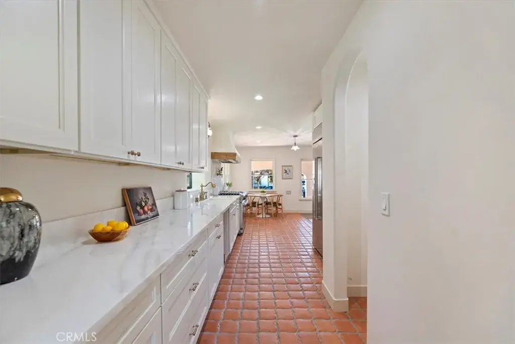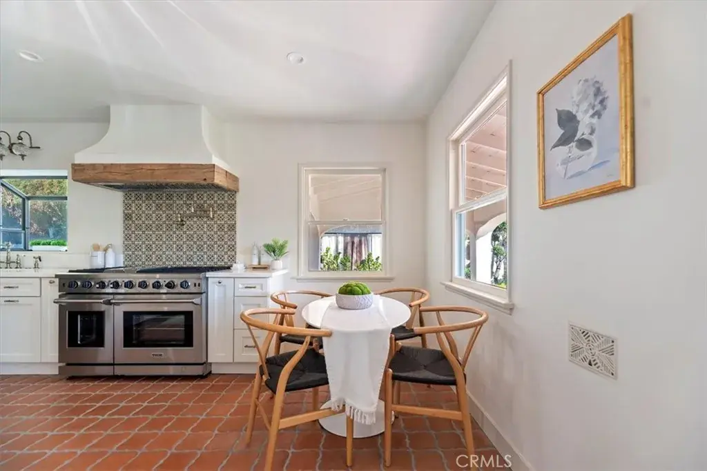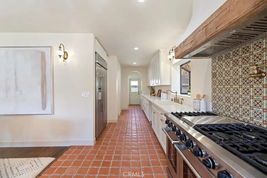 Inside, the home features original restored wood flooring complemented by terracotta Riviera tile in the kitchen and bathrooms, enhancing its warm Spanish aesthetic. The custom kitchen showcases built-in appliances, soft-closing cabinetry, and stone countertops, while the bathrooms feature coordinating stone surfaces, custom vanities, and antique brass faucets throughout, creating a cohesive and elevated design. The layout is ideal for indoor-outdoor living, with French doors in two of the bedroom opening directly to the backyard, filling the home with natural light and creating seamless access to outdoor spaces.
