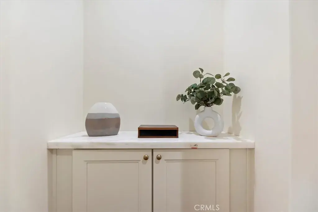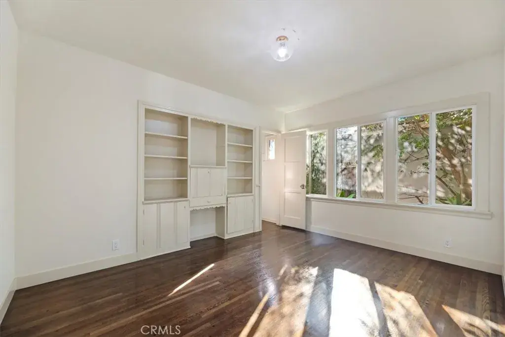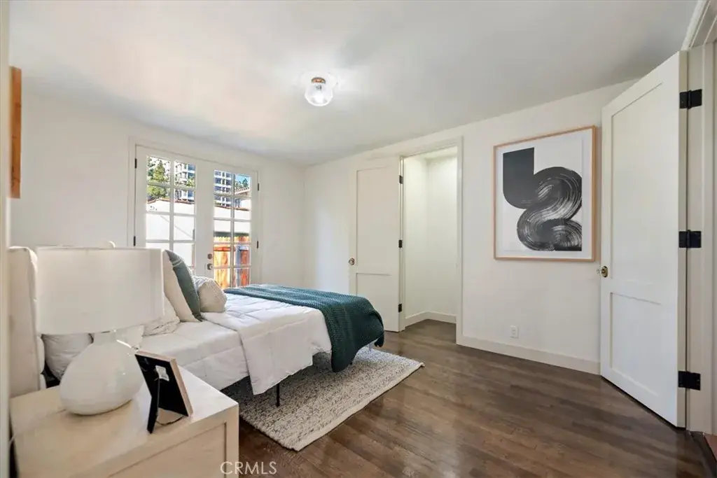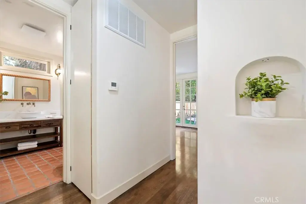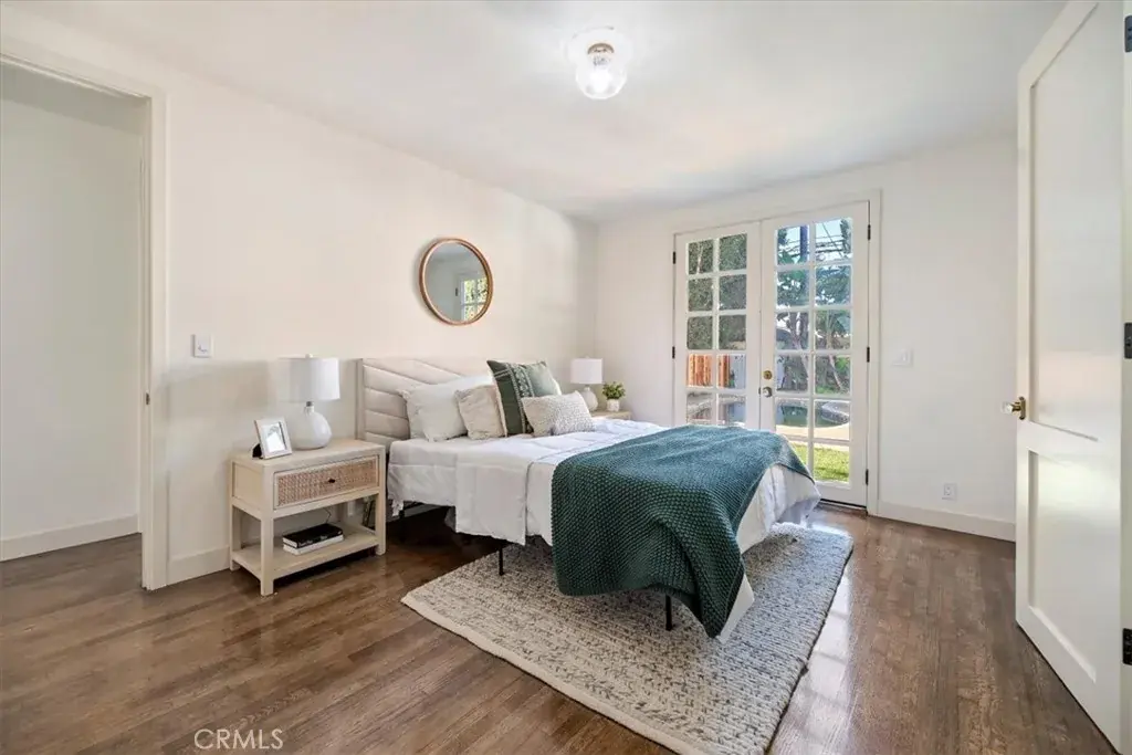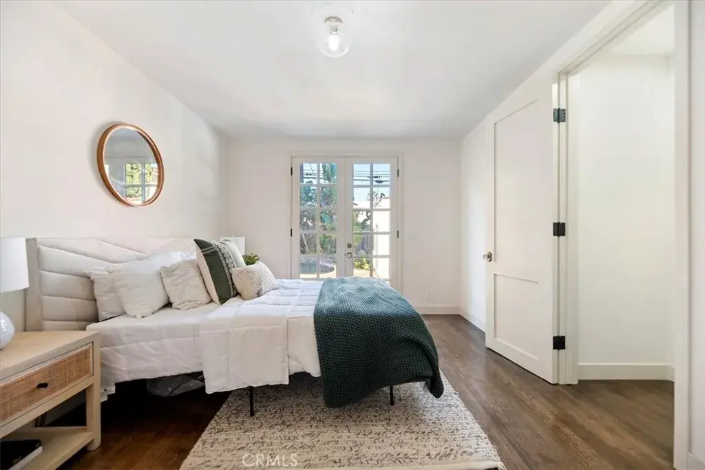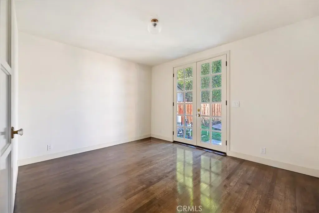 Inside, the home features original restored wood flooring complemented by terracotta Riviera tile in the kitchen and bathrooms, enhancing its warm Spanish aesthetic. The custom kitchen showcases built-in appliances, soft-closing cabinetry, and stone countertops, while the bathrooms feature coordinating stone surfaces, custom vanities, and antique brass faucets throughout, creating a cohesive and elevated design. The layout is ideal for indoor-outdoor living, with French doors in two of the bedroom opening directly to the backyard, filling the home with natural light and creating seamless access to outdoor spaces.