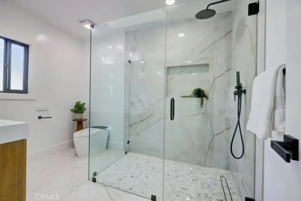 Situated on a quiet street in Long Beach, this fully remodeled home offers a functional layout with modern updates throughout. A single long driveway leads to a gated, detached two-car garage. The property features new exterior paint with black trim, manicured lawn with updated landscaping, a new front door, and an inviting front porch. Inside, the home showcases new flooring, fresh interior paint, new windows, and recessed lighting. Upon entry, the home opens to a formal living room that flows seamlessly into a formal dining area, both enhanced by large windows for natural light. The dining space connects directly to the spacious kitchen, which features brand-new appliances, abundant cabinetry, light countertops, and a matching backsplash. A laundry area is located adjacent to the kitchen. A pass-through window from the kitchen overlooks the family room with higher ceilings, a fireplace, a modern chandelier, and sliding glass doors leading to the backyard. The outdoor space has been newly landscaped and includes concrete stepping stones to a covered seating area with lattice detailing. An additional flex room off the garage provides versatile use and offers direct access to the backyard and garage. A hallway off the entry area leads to two well-sized bedrooms with closet space and an updated full bathroom featuring mosaic tile flooring, a remodeled shower, and modern fixtures. The primary bedroom offers ample space, additional closet storage, and an ensuite bathroom with a glass-enclosed shower, marble flooring, dual vanity, and skylight. Both bathrooms include smart toilets. Black fixtures throughout the home complete the modern aesthetic. This turnkey property combines updated finishes, indoor-outdoor flow, and practical living
