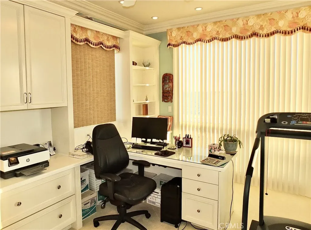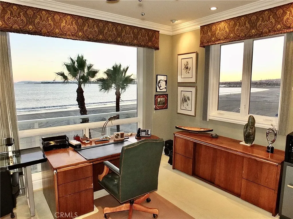 Second level: Two dedicated ocean-view home offices, two guest bedrooms, a guest bathroom, and a great room with sweeping ocean views with private balcony. Additional features include a curved, custom- designed cabinet with wine refrigerator, marble counter tops and glass shelving, along with a second custom-built cabinet providing additional storage or space for a television.