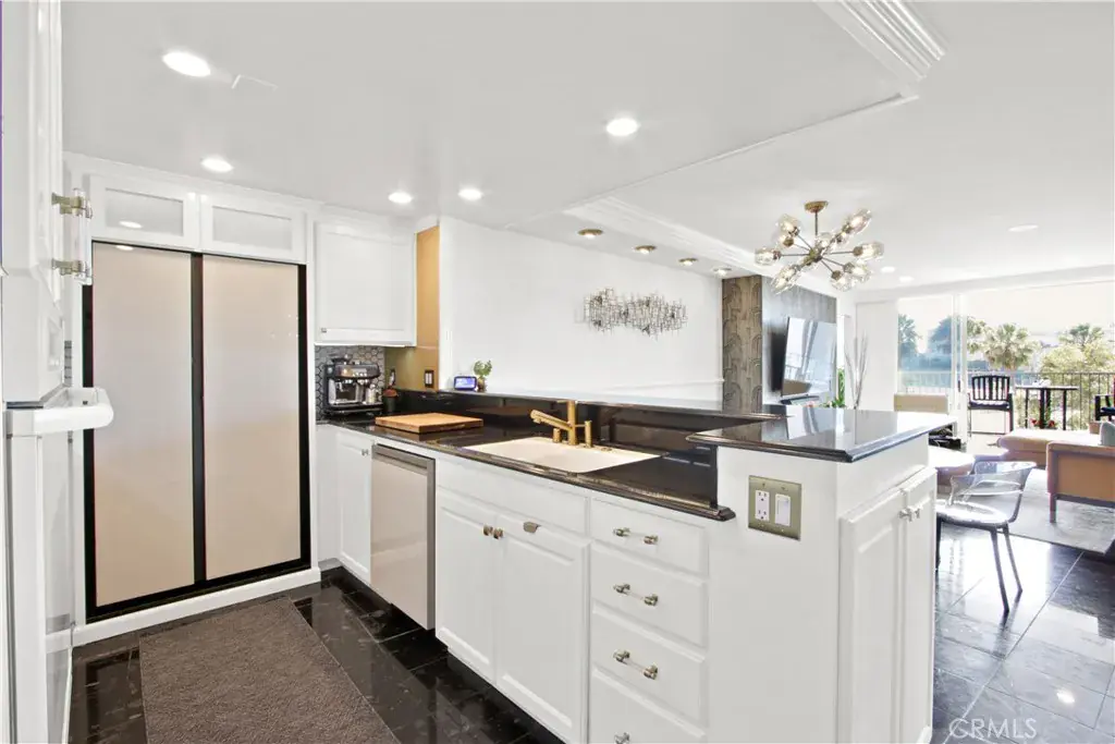 Step inside to find a beautifully remodeled, modern kitchen to your left, featuring striking black granite countertops, crisp white cabinetry, and a stylish hex-tile backsplash, perfect for preparing everything from casual bites to full dinners. The kitchen opens seamlessly to the dining area, highlighted by a custom light fixture and an elegant wood dining table, ideal for entertaining.