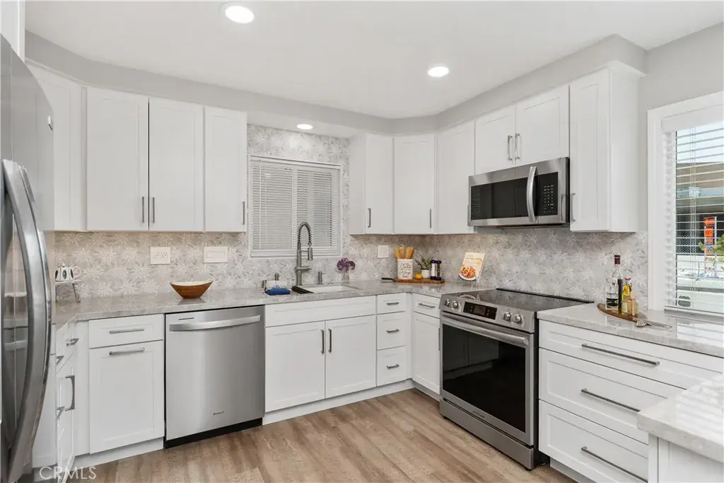 Welcome to 1837 N Studebaker Road, Long Beach – a beautifully remodeled, truly move-in-ready home with outstanding curb appeal. From the moment you arrive, you’ll appreciate the manicured landscaping, inviting tiled front porch, and elegant leaded glass front door with electronic keypad entry. Inside, the welcoming entry hall opens to a spacious living room highlighted by a classic brick fireplace and sliding glass doors that lead to a private backyard retreat. The brand-new gourmet kitchen is a true focal point, featuring premium Master Brand Diamond cabinetry with under-cabinet LED lighting, Quartzite Taj Mahal countertops, and a custom marble mosaic backsplash. A high-end Kraus Turino 33” fireclay workstation sink with cutting board and drying rack, paired with a Kohler Pro faucet, delivers both beauty and functionality. Top-of-the-line Frigidaire Gallery stainless steel appliances and an extra-large capacity Whirlpool dishwasher complete this impressive space. The kitchen flows seamlessly into the dining area, where a large picture window captures views of the lush front yard. The primary bedroom offers a peaceful escape with direct access to a private patio, ideal for relaxing. The spa-inspired en-suite bathroom has been fully remodeled with a dual-sink vanity, granite countertops, and a custom walk-in shower with frameless glass enclosure. Remodeled hall bathroom with granite countertops, a custom-tiled tub/shower & a frameless shower door. Two additional nicely sized bedrooms provide flexible options for family, guests, or a home office. Additional highlights include luxury vinyl plank flooring, dual-pane windows and sliding doors, recessed lighting, central heating and air conditioning, upgraded plumbing, a Ring Pro doorbell and alarm system, and a new Owens Corning roof (2024). The serene backyard is perfect for outdoor enjoyment, offering a patio, vinyl fencing, mature landscaping, and a convenient storage shed. The oversized two-car garage features a dedicated laundry area complete with a new stainless steel utility sink and durable rubber flooring at the laundry and garage entry/exit. Ideally located near highly regarded Tincher Preparatory School and Sato Academy of Math & Science, parks, shopping, and everyday conveniences, this exceptional home offers the perfect blend of comfort, quality, and location. Don’t miss the opportunity to make this beautifully upgraded home your own. Please refer to supplements for the full list of amenities.