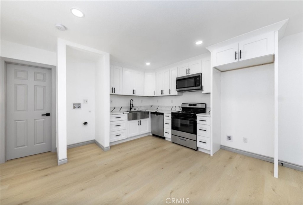 Enjoy a bright open layout featuring fresh white walls, luxury light-wood flooring, and thoughtfully selected finishes throughout. The stunning kitchen boasts brand-new shaker cabinets, marble-style counters, a farmhouse stainless steel sink, and stainless steel appliances, including a stove, microwave, and dishwasher. A dedicated laundry nook offers easy hookups for your washer and dryer.