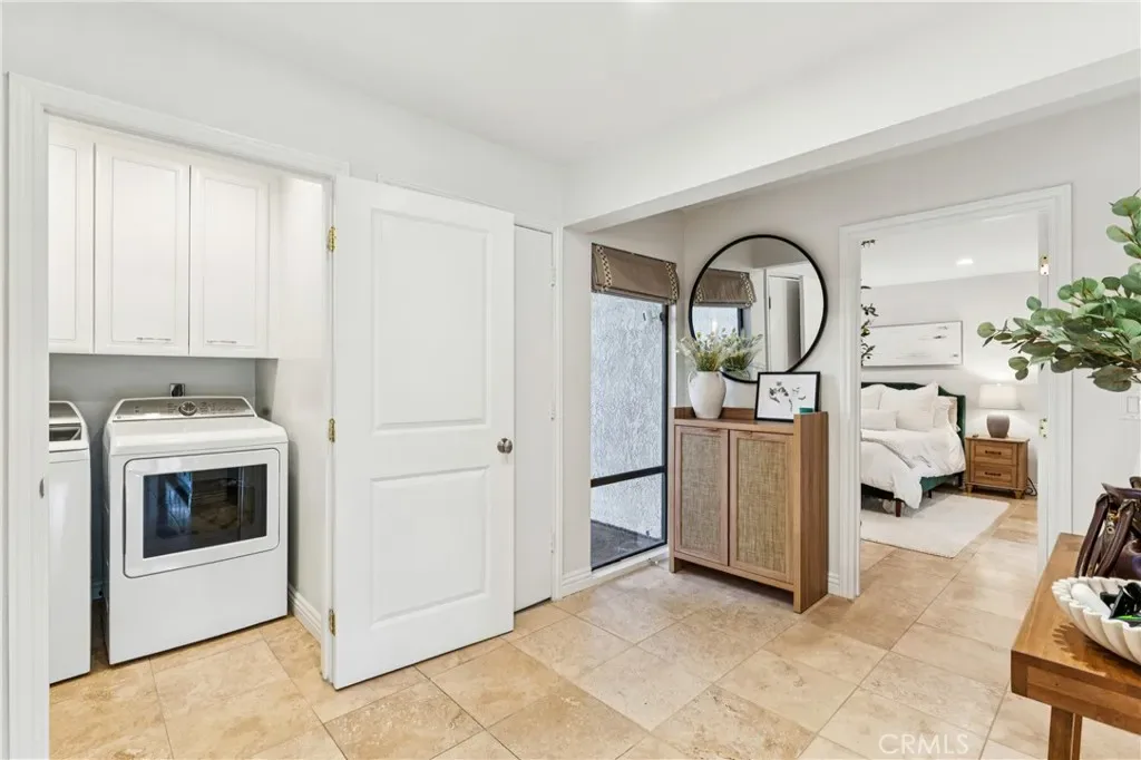 primary closets for a tailored finish. Additional improvements include a new water heater, new washer and dryer, and custom drapery throughout — including blackout treatments in the bedrooms and living room. The spacious living area opens to an extended private patio with marina and pool views,