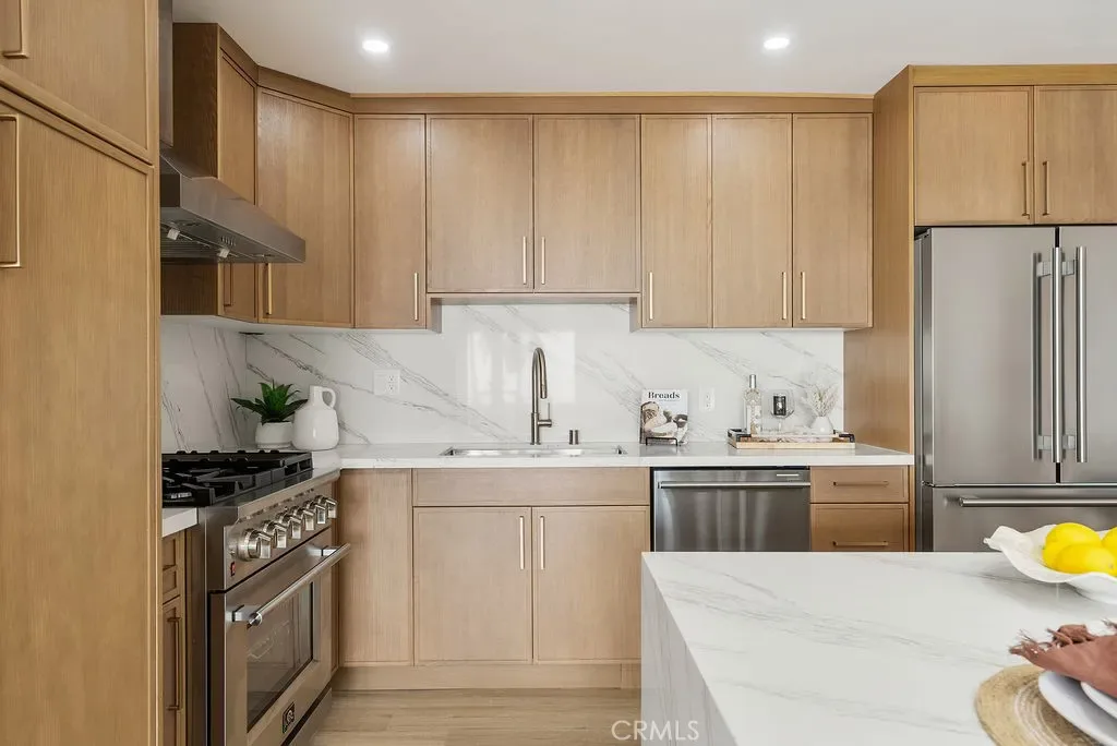 Stunning and fully renovated, this beach-facing condo with a private outdoor patio has been reimagined from top to bottom with exceptional attention to detail. The 2-bedroom, 2-bath residence offers 1,034 sq. ft. of modern coastal luxury, showcasing brand-new interiors crafted with contemporary elegance and smart functionality. Step into a bright, open layout featuring all-new windows, exterior slider doors, and an upgraded front entry door. The home includes a complete HVAC system with new ducting, new flooring throughout, upgraded baseboards and trim, stylish hardware, recessed lighting, and designer fixtures. At the heart of the home is a chef-inspired kitchen appointed with custom white oak cabinetry, a waterfall-edge quartz island, and a premium appliance suite. Both bathrooms were rebuilt down to the studs and finished with new waterproofing, modern tilework, high-end fixtures, custom glass enclosures, and beautifully designed vanities—creating a spa-like experience. Enjoy the comfort and confidence of a comprehensive renovation, paired with the serenity of your private patio just steps from the sand. The well-maintained midrise community offers lush landscaped gardens, a barbecue area, elevator access, secure garage parking with an assigned space, laundry facilities, a security gate, and a full security system—perfect for an effortless, lock-and-go lifestyle. Experience the best of coastal living, with boutique shopping, popular restaurants, and beachside strolls just moments from your door. Call for a showing today!