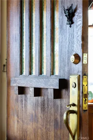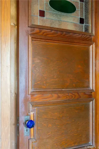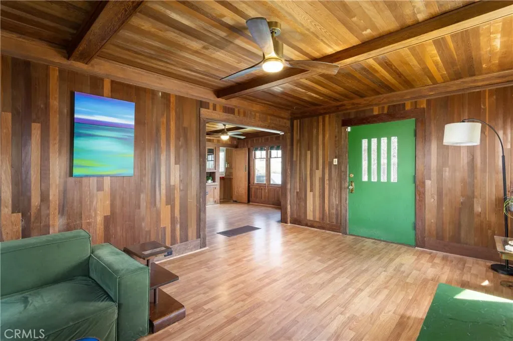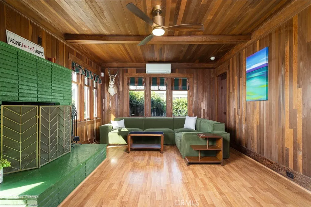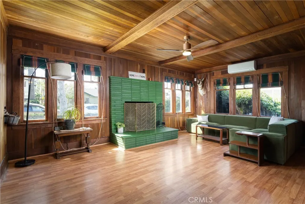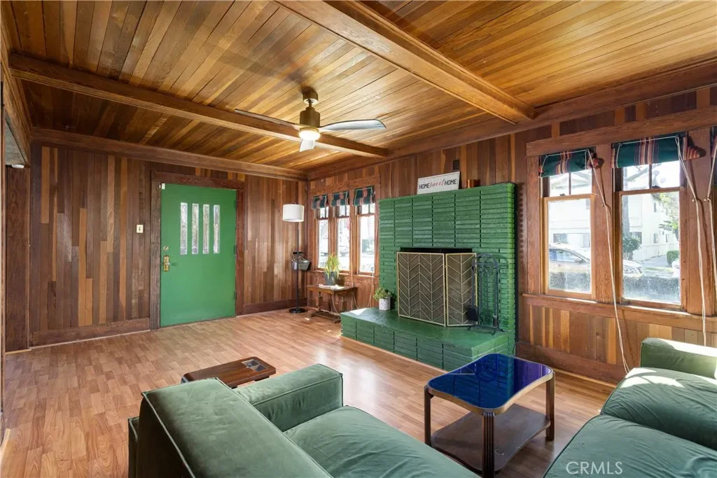 There is a large front porch with the original oak front door to the living room, and French doors to the dining room. The open living room and dining room feature natural wood paneling on the walls and ceilings. There is a wood burning fireplace, custom Roman blinds, and ceiling fans. The dining room features the original buffet cabinetry, and a custom swinging door with stained glass to the hallway. There is an abundance of natural light from the original wood framed windows.