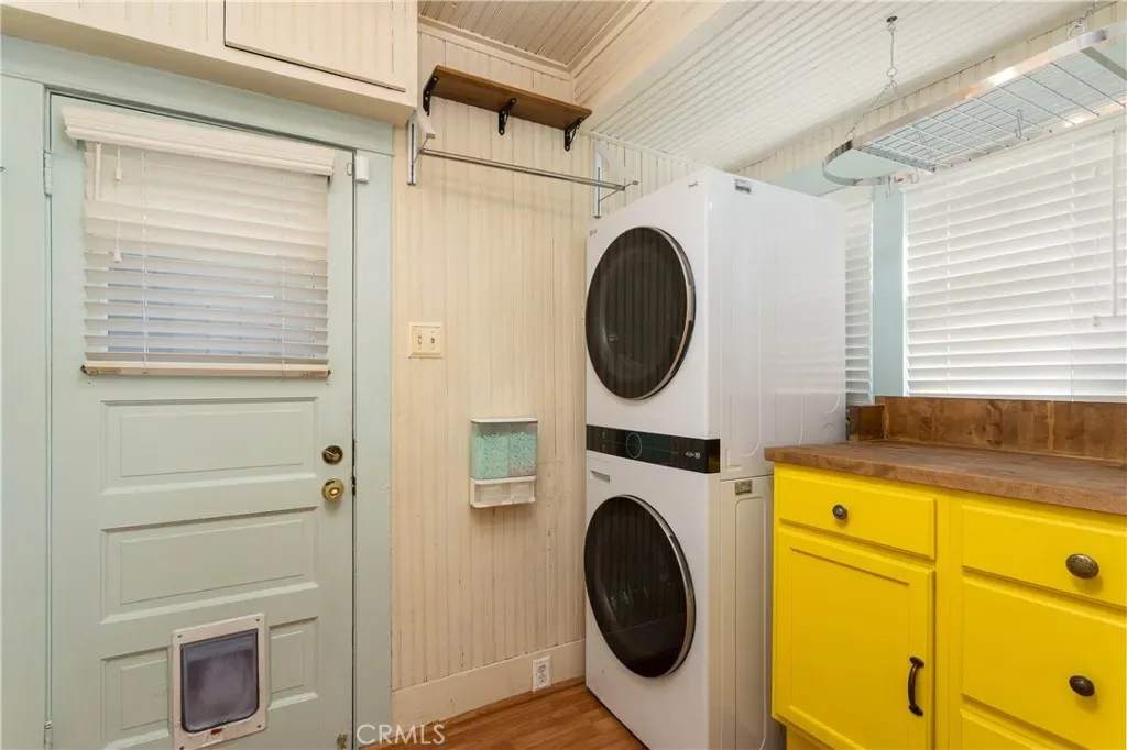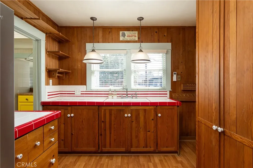The kitchen has vintage wood cabinetry, and tile countertops. There is an abundance of storage space in the kitchen. All appliances stay. The laundry room is adjacent, washer and dryer stay. There is a screened back porch/catio as well.
