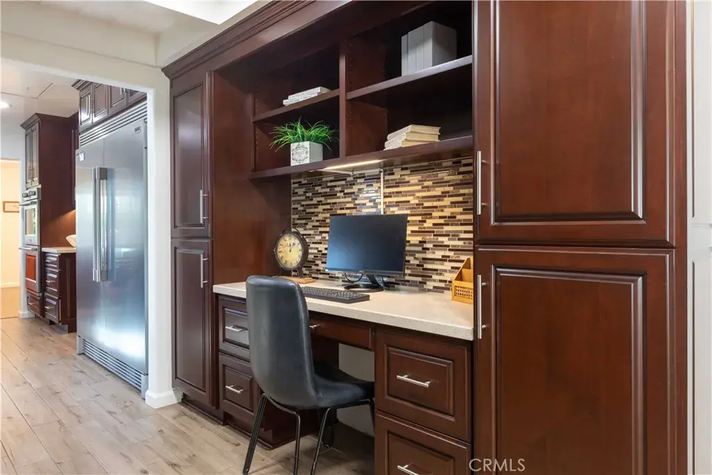 The heart of the home is the chef’s kitchen, featuring double ovens, a professional-series 5-foot-wide refrigerator, custom-built, solid wood cabinets complemented by gleaming quartz countertops, 6 burner gas range, & pot filler. Adjacent to the kitchen are a walk-in pantry, a dedicated laundry room with sink, and a convenient half bath. Custom cabinetry continues into the hallway, offering elegant storage and desk space before flowing seamlessly into the den’s built-in bar.