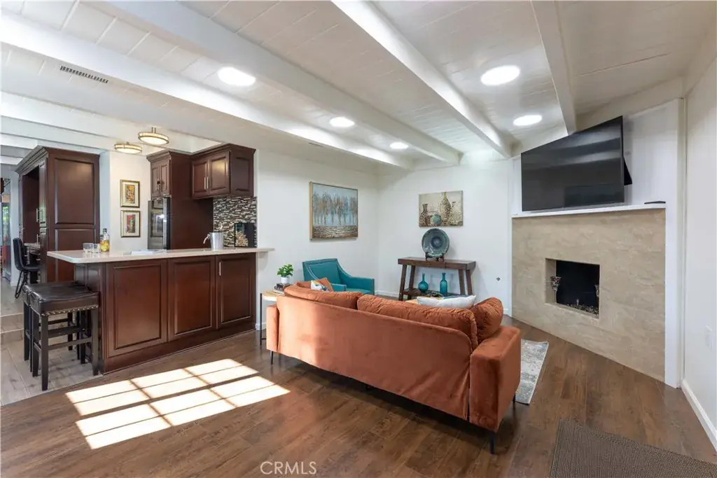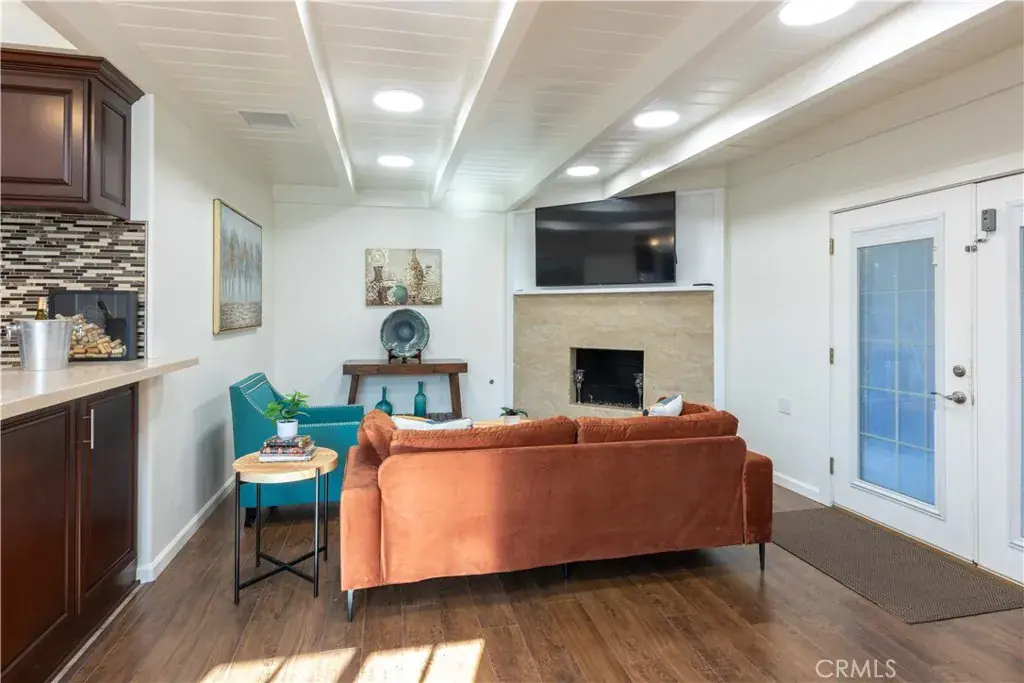 The wet bar is truly an entertainer’s dream, complete with a full-size dual-zone wine refrigerator. It anchors the cozy den, which features a gas fireplace and French doors that open to an enviable backyard.
