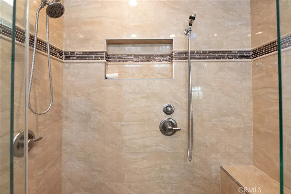 The home offers three well-appointed bedrooms, including a spacious primary suite with dual closets. One is cedar-lined with a built-in wall safe; the other is a walk-in closet with custom built-ins, located off the primary bath. The tastefully updated primary bathroom includes dual sinks and dual shower heads for a spa-like experience. Exit directly from the primary suite to the backyard oasis.