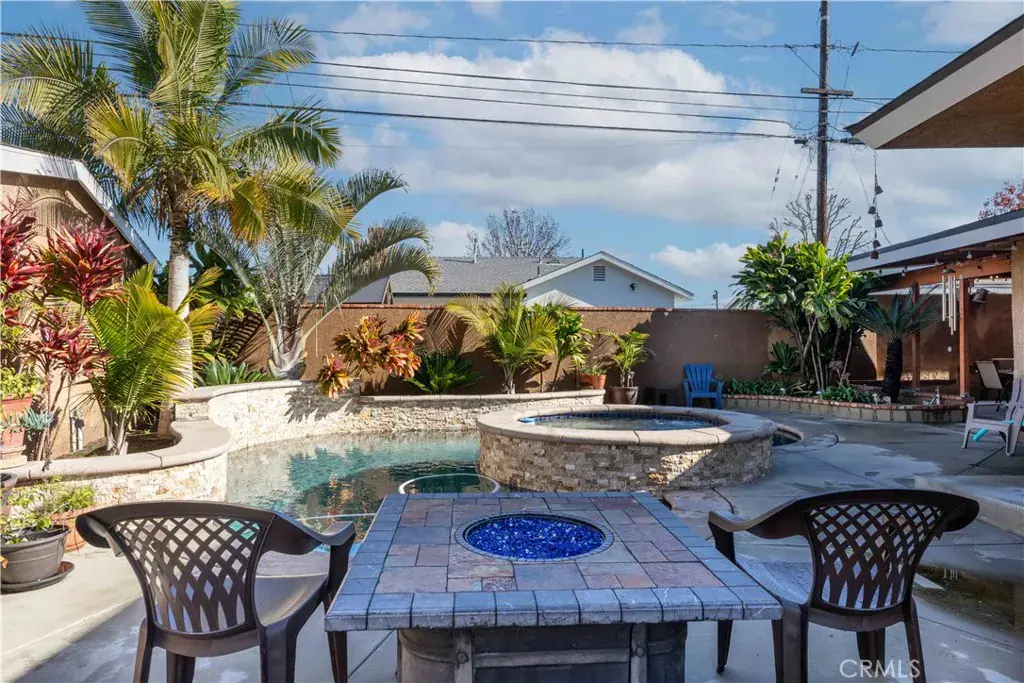 Completed in 2019, the resort-style pool features an overflowing spa, a sun shelf with umbrella mount, customizable lighting for night, and ample space for entertaining. While not visible, the yard has been pre-plumbed with two gas lines, ready for a future outdoor kitchen.