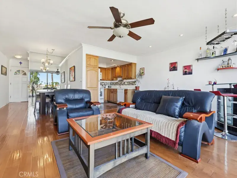 Inside, hardwood flooring and crown molding throughout create a refined and cohesive interior. The entry opens to a defined dining area highlighted by a dedicated light fixture, flowing seamlessly into a spacious living room. Large windows and sliding glass doors fill the space with natural light and open to a nice private balcony, ideal for indoor-outdoor living and enjoying the surrounding bay views.